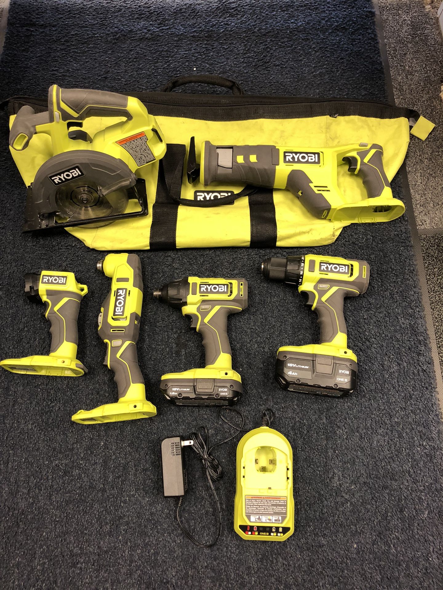 Ryobi 18V 6 Piece Combo Kit, Includes PCL206 1/2" Drill, PCL235 Impact Drill, PCL500 5-5/2" Circular Saw but missing the wing nut to control the angle of the blade, PLC430 Multitool, PCL515 Reciprocating Saw, PCL660 Flashlight, PCG002 Charger, (1)PBP002 1.5 Ah and (1)PBP005 4.0 Ah Batteries, Comes in a green carry bag. All in good condition and works as intended. 8679 JM