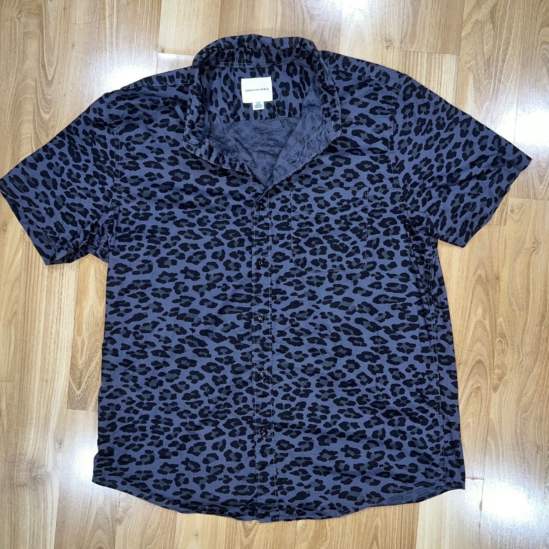 Black and grey leopard print button up shirt w/ front patch pocket.