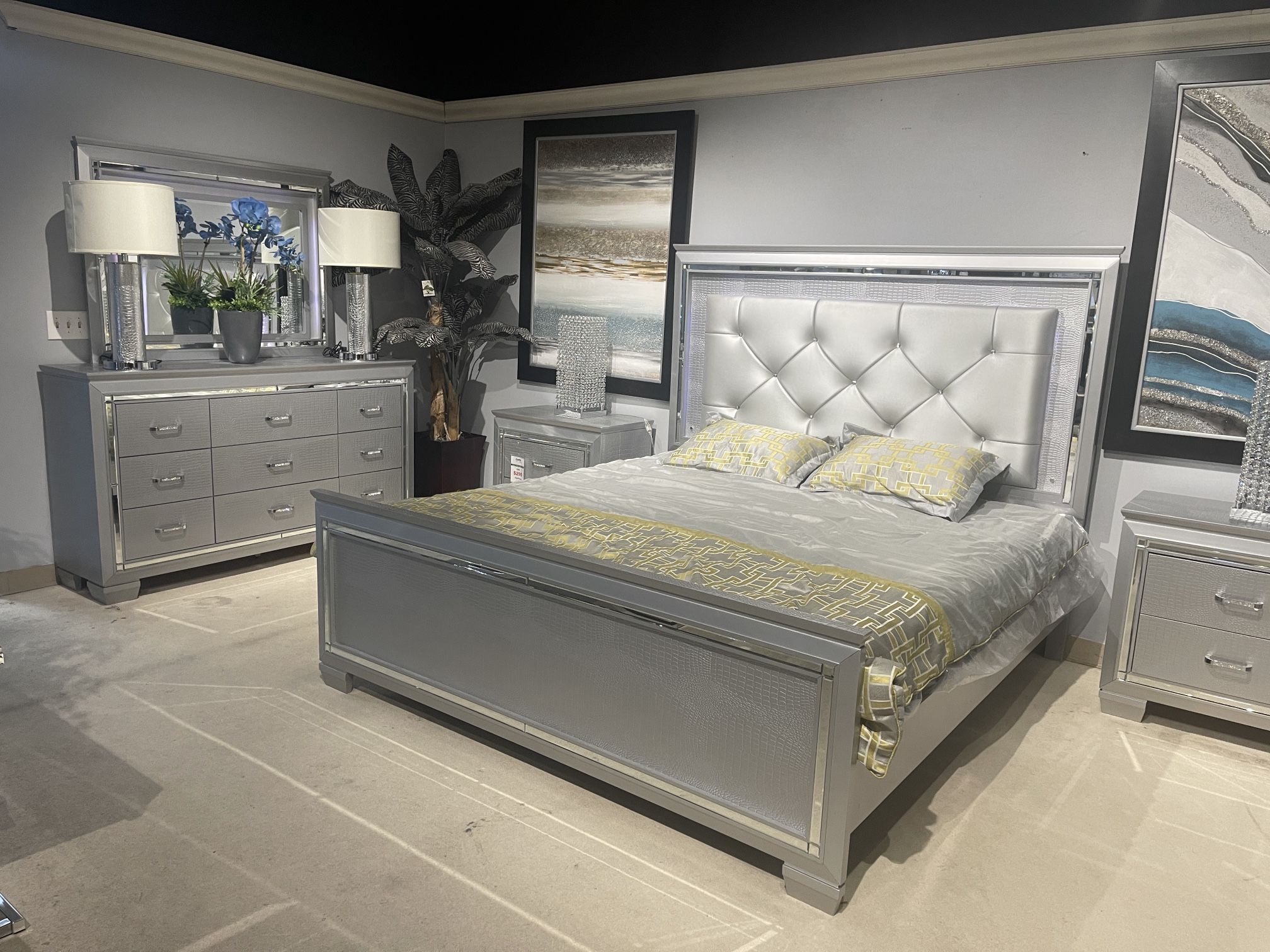 Glamour reigns in the design of the Veronica Collection. Framing each piece is a decorative beveled mirror accent that enhances the illumination from the touch-engaged LED back-light of the headboard and mirror, as well as the under-light of the night stand. Alligator embossing and high polished crystal-enhanced hardware boldly accent the available silver or black finish of the collection.