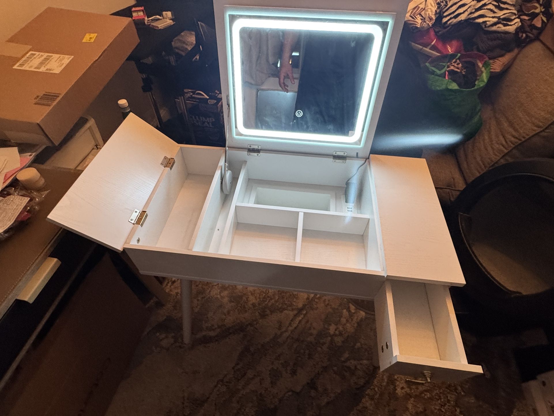 Selling a make up vanity in great condition with LED light attached on the mirror , great make up station not too bulky if you are looking for something compact with a lot of space this is it. Comes with a chair ( small stool) . Price it is little negotiable.