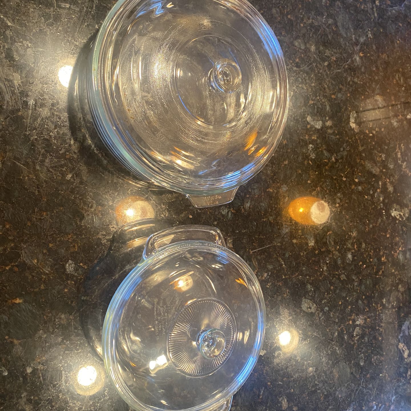 2 round, clear, heat-resistant glass baking dishes in great condition. Sizes 3.2 qt & 1.5 qt. They are oven, microwave, and dishwasher safe, designed for baking, serving, and storage. The lids feature integrated handles and a knob in the center, which helps retain heat.