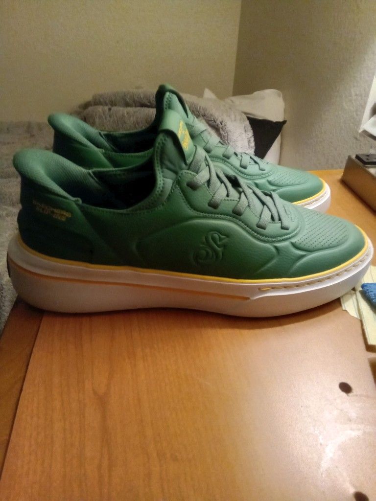 A pair of matte green low-top sneakers with perforated toe boxes, embossed side logos, green laces, yellow tongue and heel accents, and a thick white platform-style sole trimmed with a thin yellow stripe