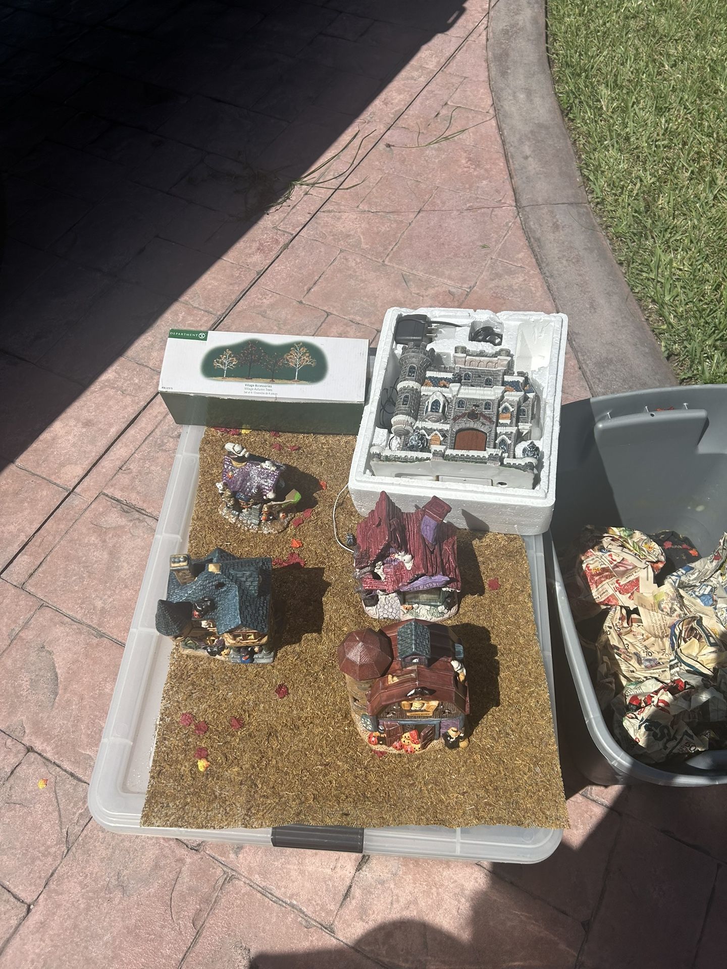 Entire halloween village lot and accessories. About 6 houses made of porcelain, lights, characters, trees. All must got. Firm $30 must pick up in Hialeah. Comes in big Tupperware bin.