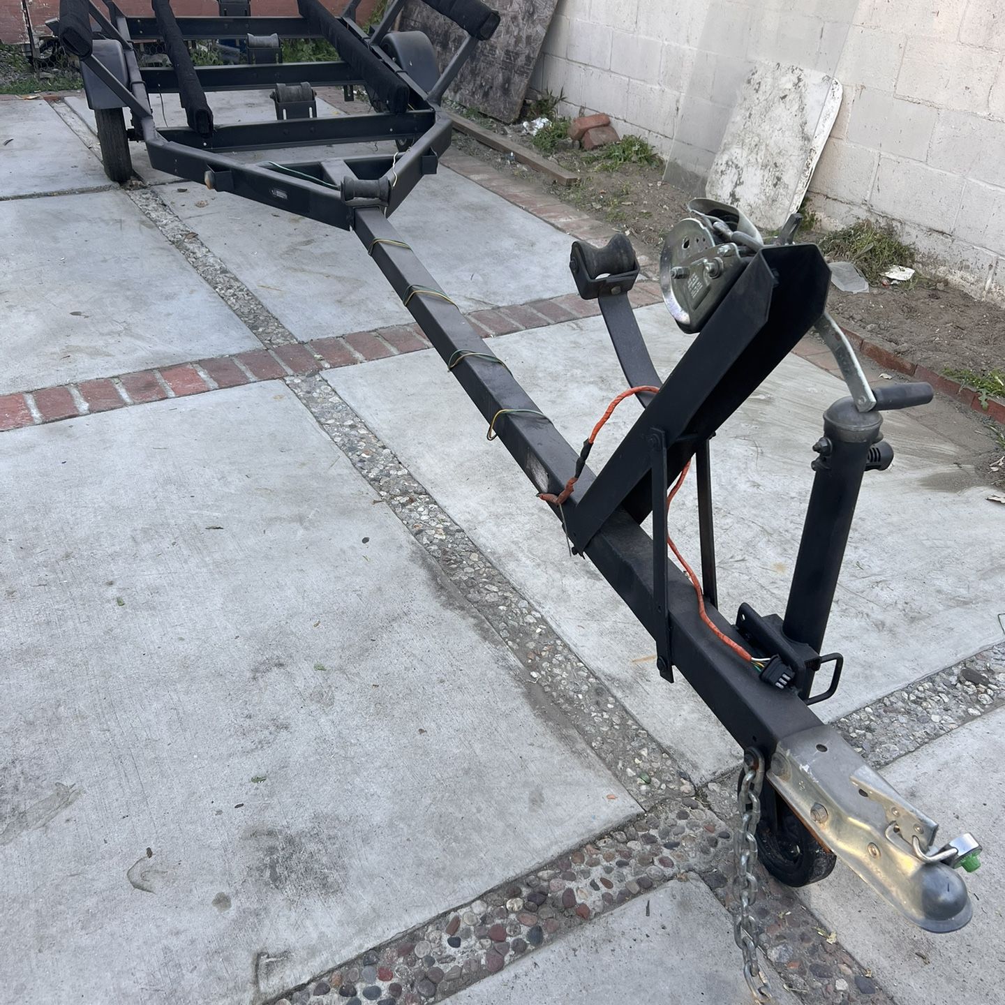 Black boat trailer with rollers, bunks, winch, hitch, safety chains, and electrical connector for lights. Good for transporting boats. The trailer is 17’6” overall length. It’s a single-axle boat trailer best suited for 12–15 ft V-hull boats. Typical capacity is around 800–1,200 lbs, depending on the boat. No title, but it does have a CA DMV-assigned ID plate. Sold as-is. Buyer is responsible for registration.