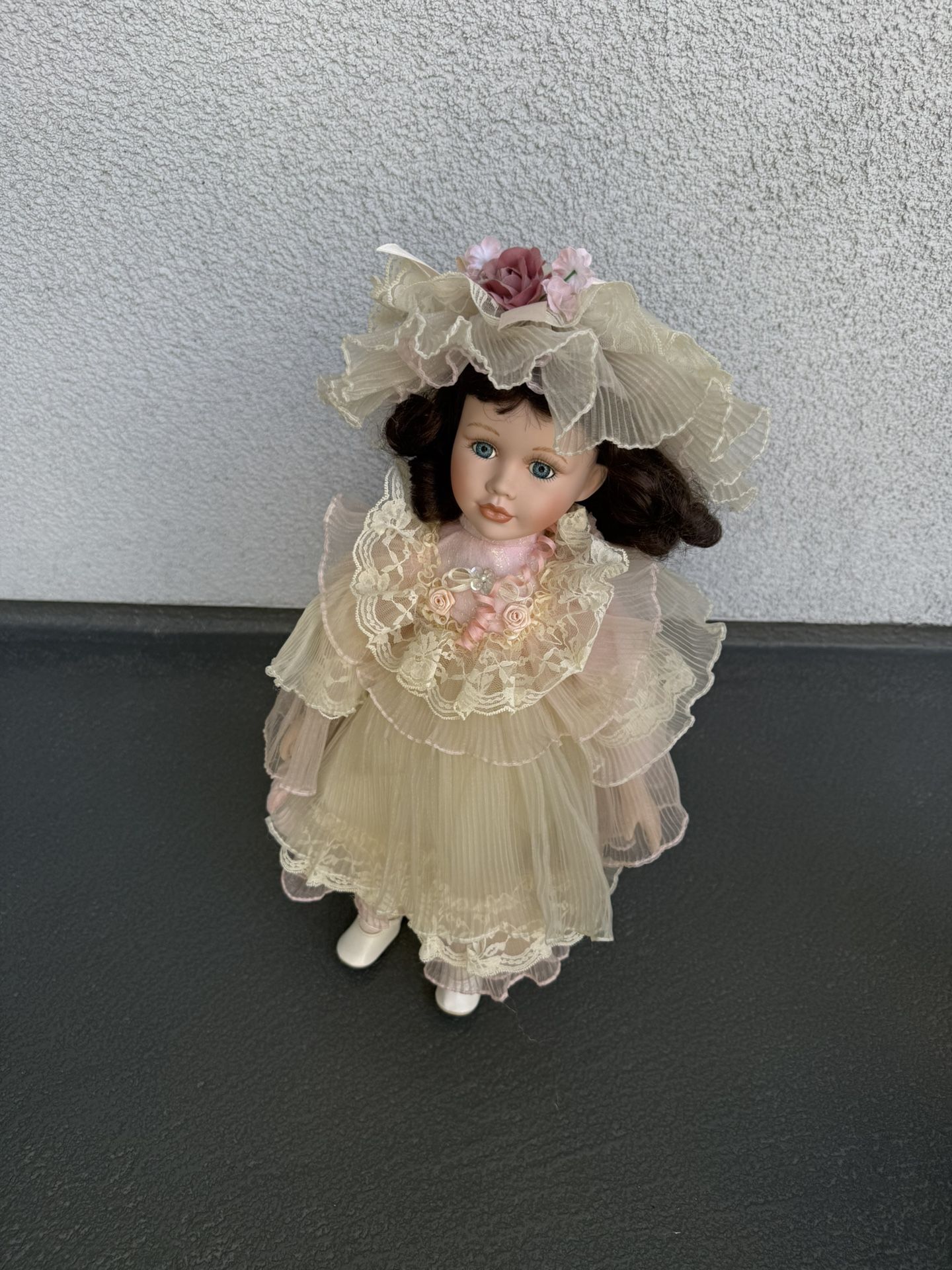 • Era: 1980s • Condition: Excellent (no visible cracks, chips, or damage; dress, hat, and accessories well preserved) • Features: Hand-painted face, glass-look eyes, lace and pleated layered dress, matching bonnet with floral details, white shoes, carrying pouch accessory • Style: Victorian / collectible display doll ➡️ Doll and table + chairs set sold separately ➡️ North Hollywood pickup and cash only