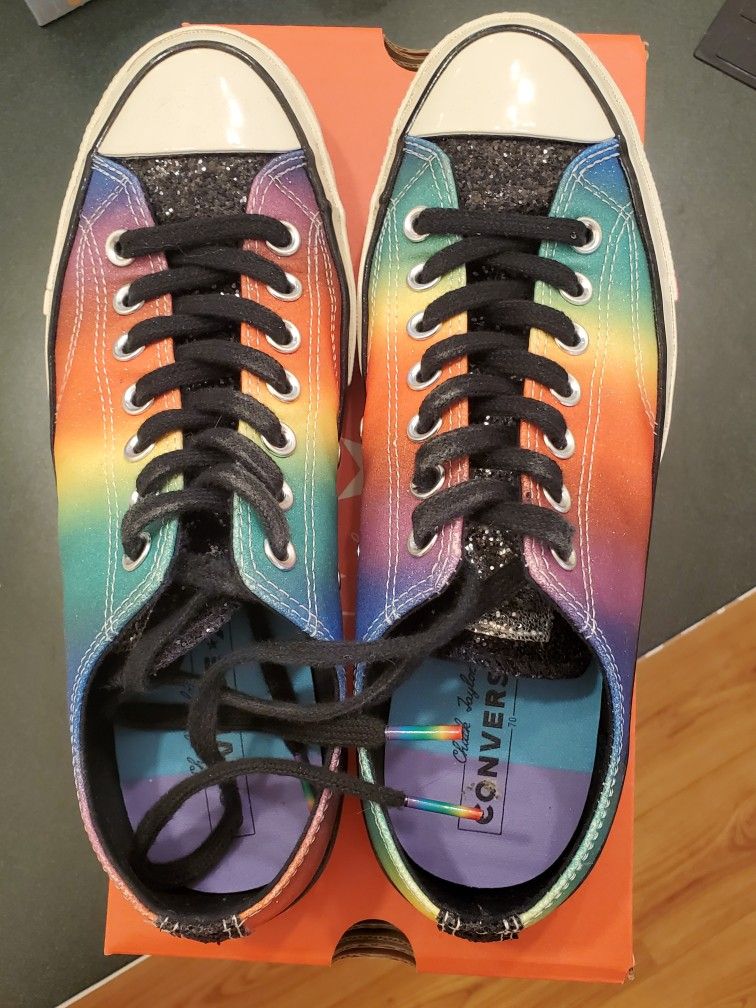 50th Anniversary Pride Converse, worn once. Size 8.5 in men's, 10.5 in women's. Has silver sequined lighting bolt on both tongues. Limited edition. Perfect condition.