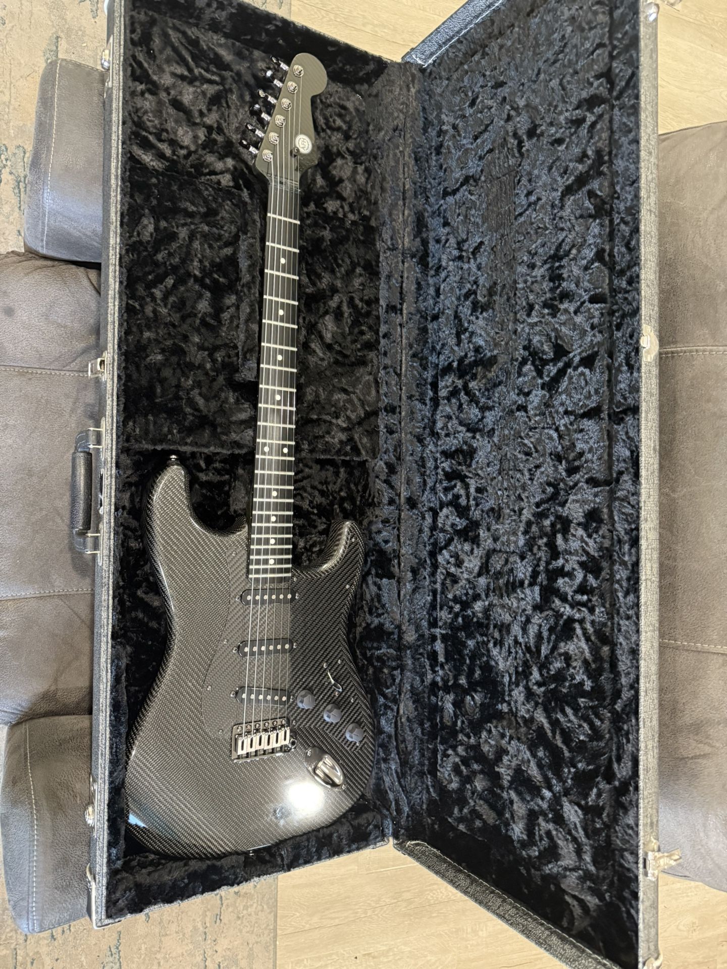 Jump on your chance to own this one of a kind carbon fiber start guitar custom built and ready to play and show off. You will not find another guitar like this. Neck is completely made of carbon fiber which is strong and durable and feel smooth playing. Body is alder with carbon fiber over lay. Pick guard and neck plate and back plate are real carbon fiber as well. Hardware is gunmetal. Tuners are locking Gotoh 510’s only quality parts and build went into this guitar. Pickups are custom wound with a sound complement to the guitar very clear and powerful but has a lot of versatility. Comes with custom Fender case to complement the prize inside. Do not want to sell this one but need to clear out some of my baby’s… Please don’t lowball and NO TRADES PLEASE.
