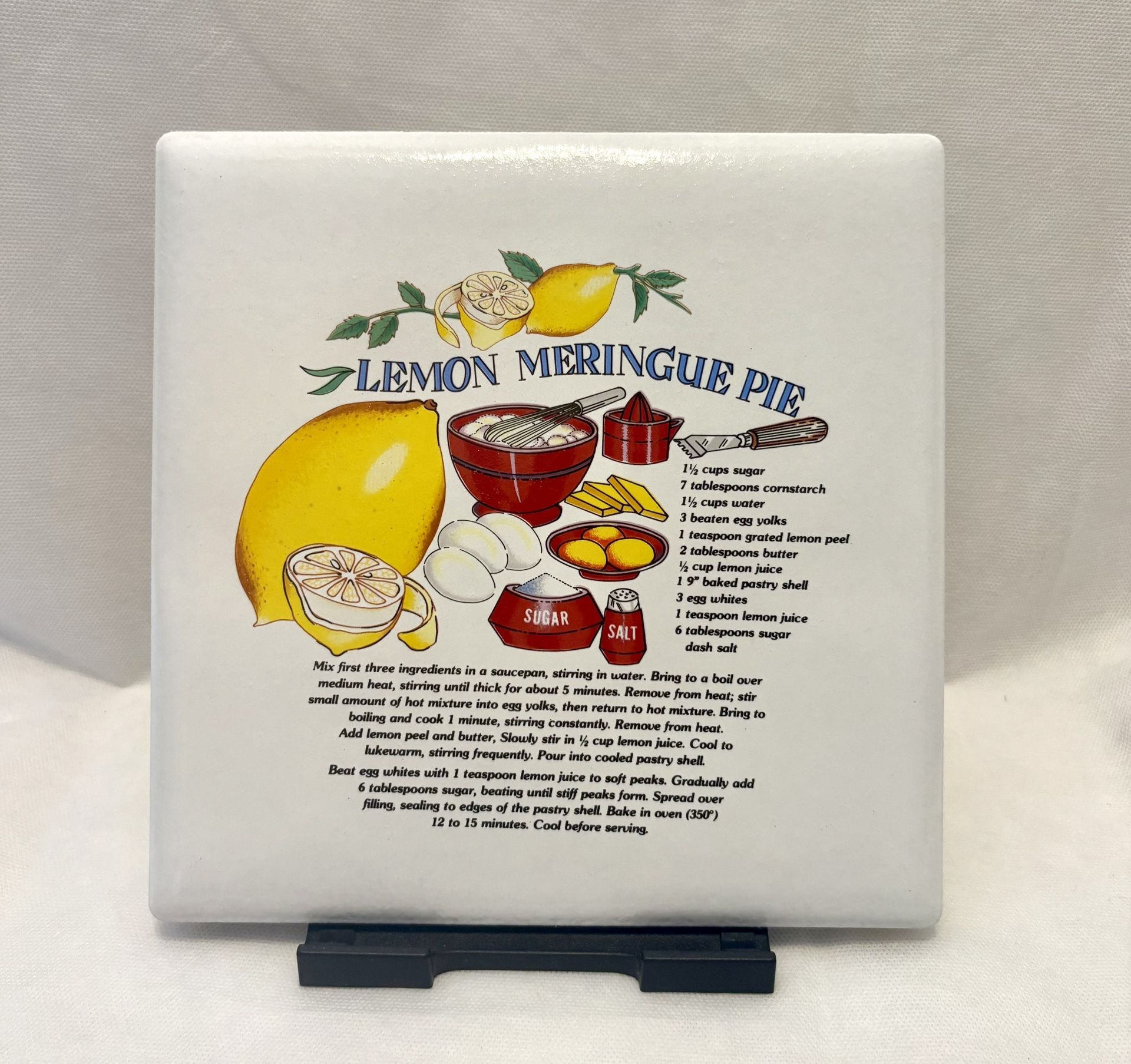 Lemon Meringue Pie Trivet Tile Ceramic tile with a recipe for lemon meringue pie. Excellent condition; no chips, no cracks, no repairs. Measures: 8.75” square