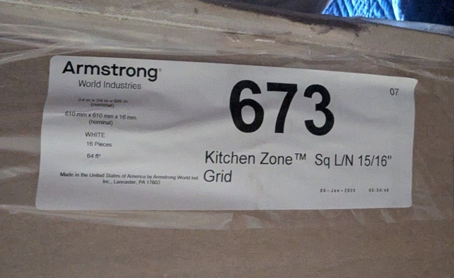 New Armstrong Kitchen Zone 673 ceiling tiles. 2 ft × 2 ft white acoustic drop ceiling panels. 10 pieces available (from a 16-piece case). Great for replacing damaged tiles in a suspended ceiling