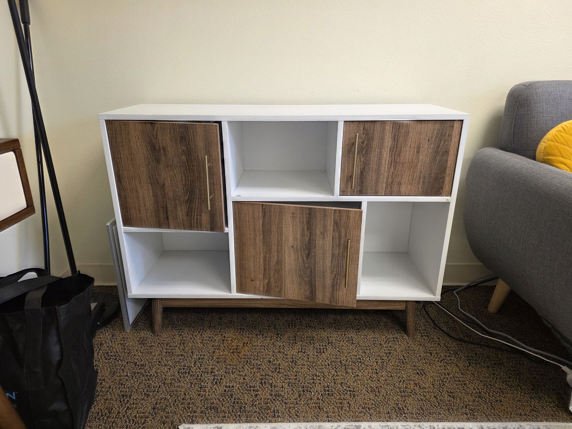 This is a wood cubby cabinet with 3 doors. No damage but top is a bit worn.