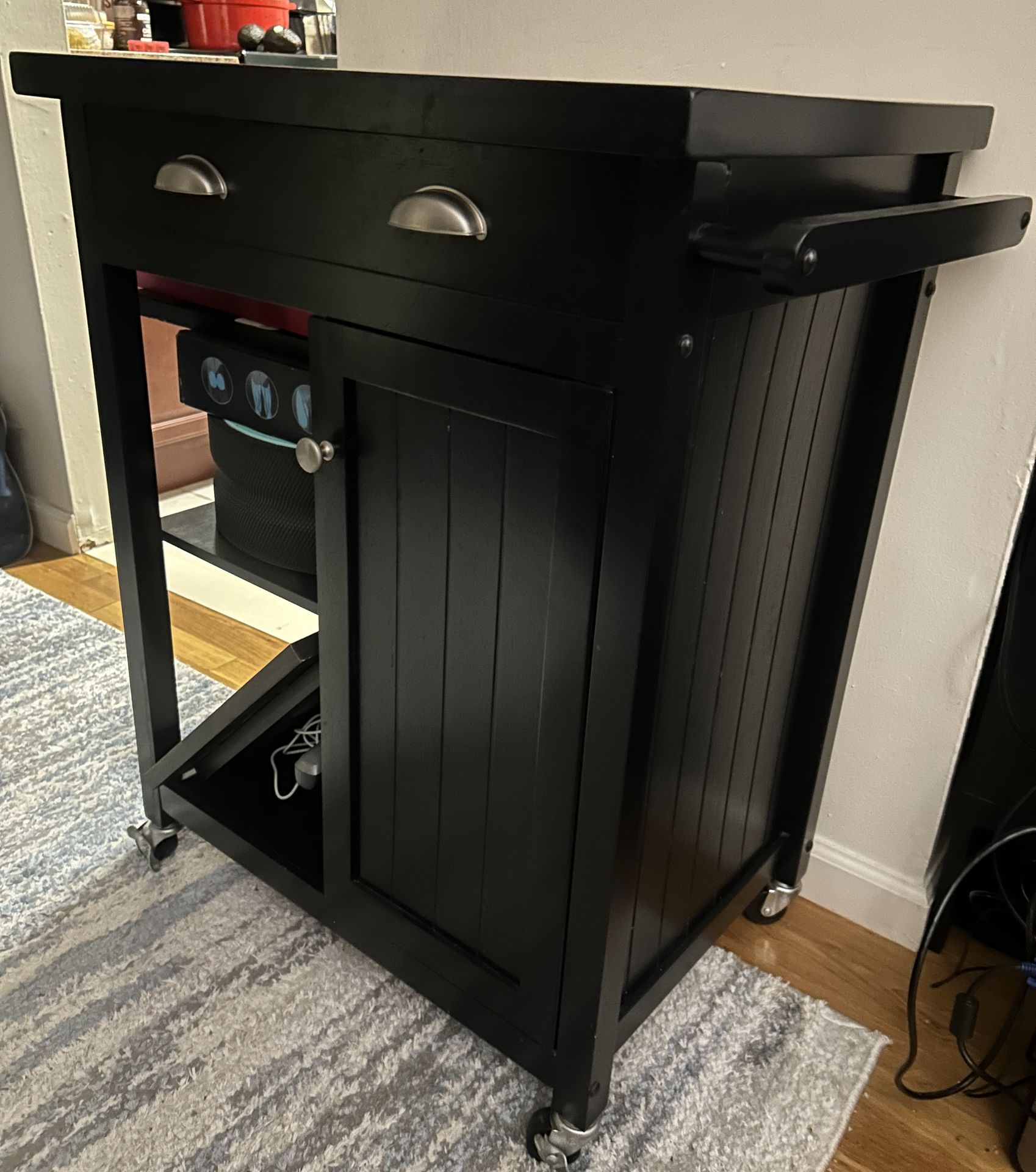 Black kitchen cart with 1 drawer, 2 shelves and 1 cabinet with 2 shelves. Has 4 locking wheels and a towel bar on the right side.