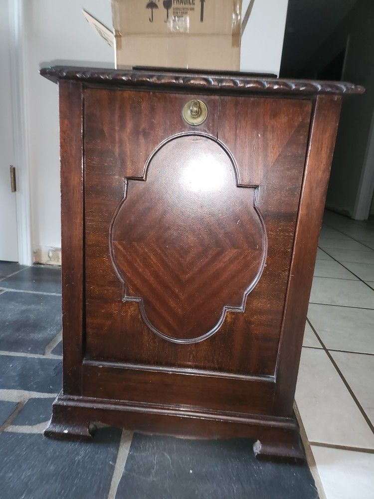 Beautiful wooden cabinet with ornate carved detailing and a built-in metal compartment (traditionally used for coal or ashes). $250 or best offer