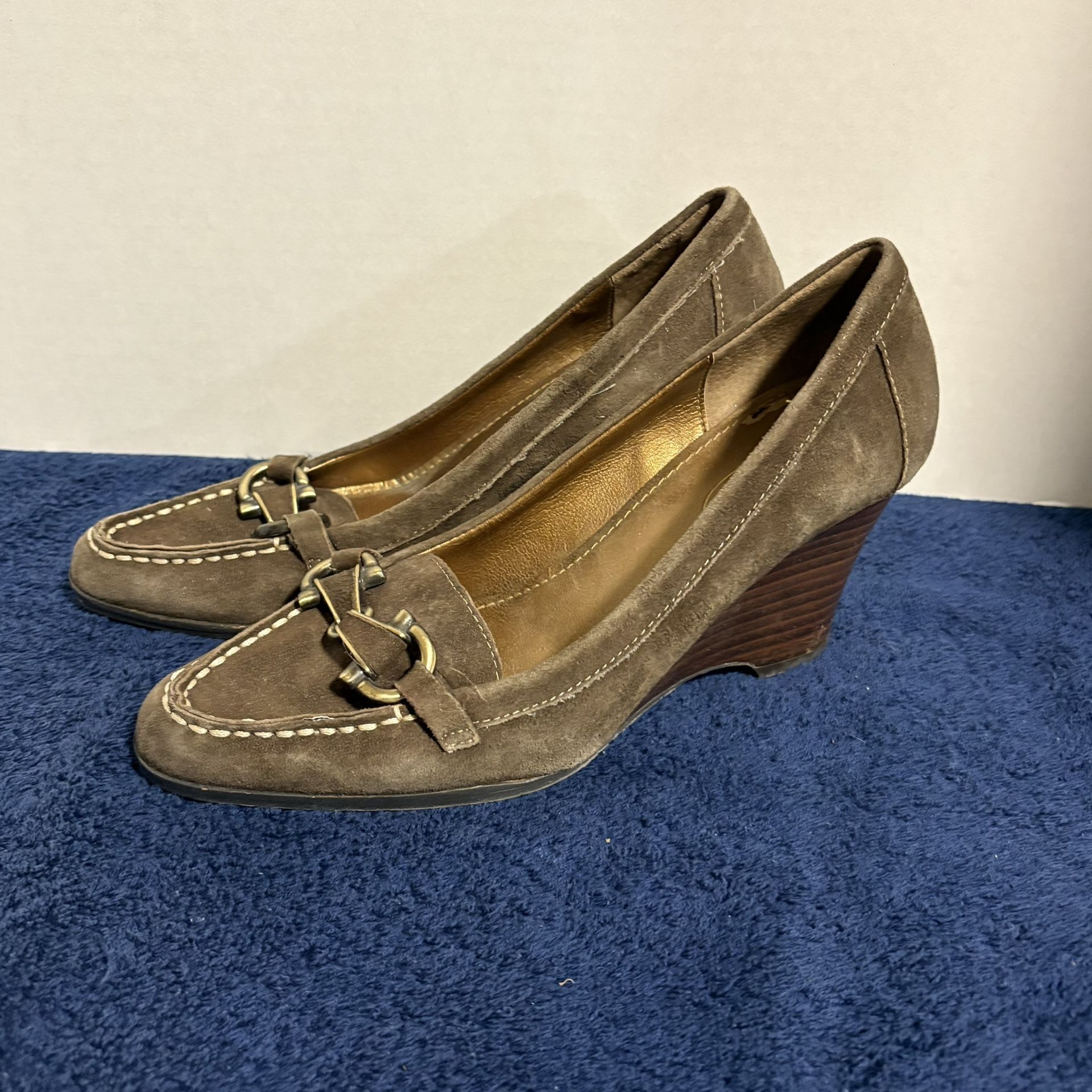 Talbots Brown Suede Wedge Heel Loafer Brass Horse Bit Buckle Womens 7.5B 7.5