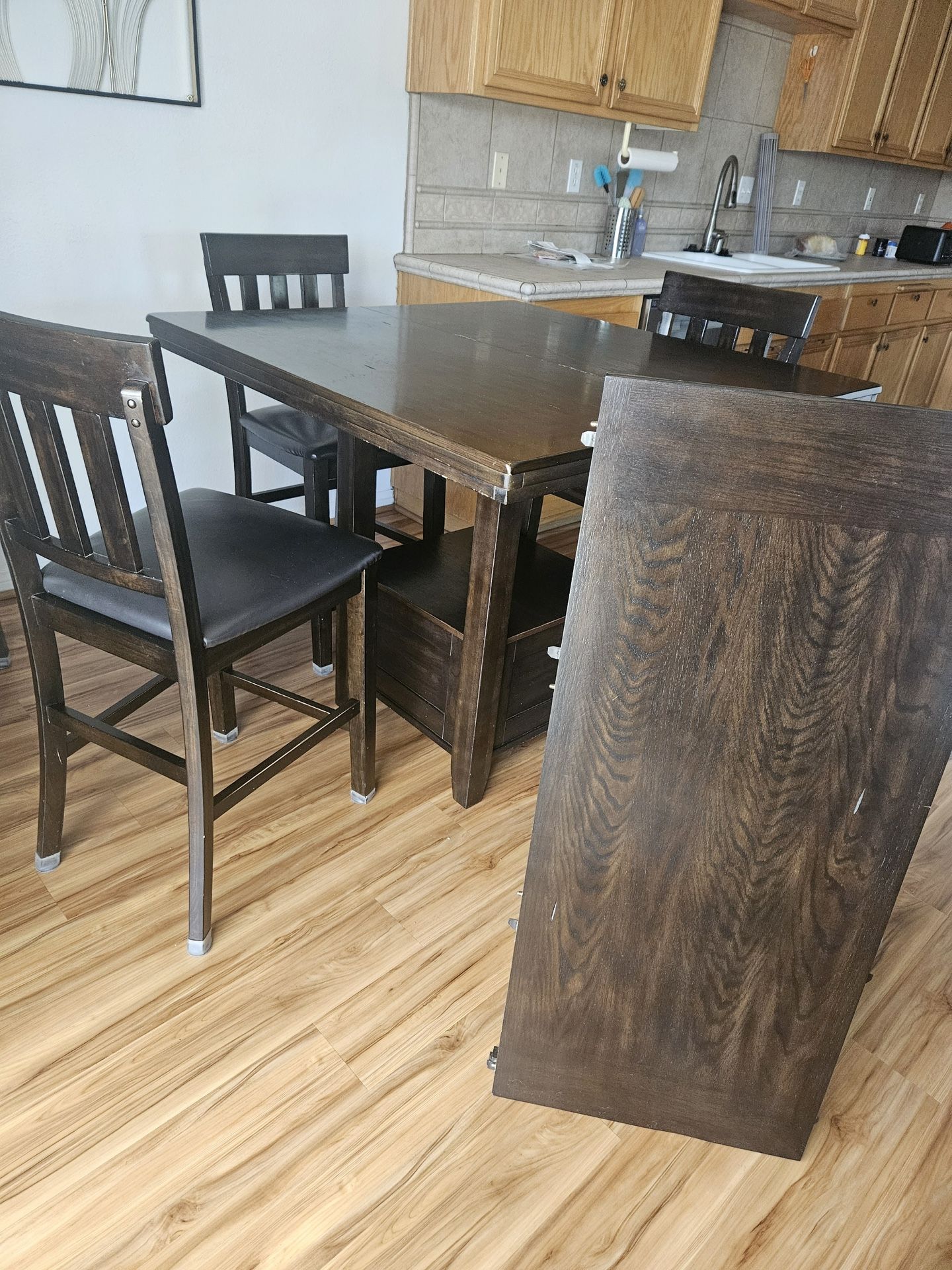 Brown wood table with navy blue seat cushions. Gently used, good condition. Counter height 36 " Table 42" x 42" Center leaf will extend additional 18" to table. Includes 5 chairs