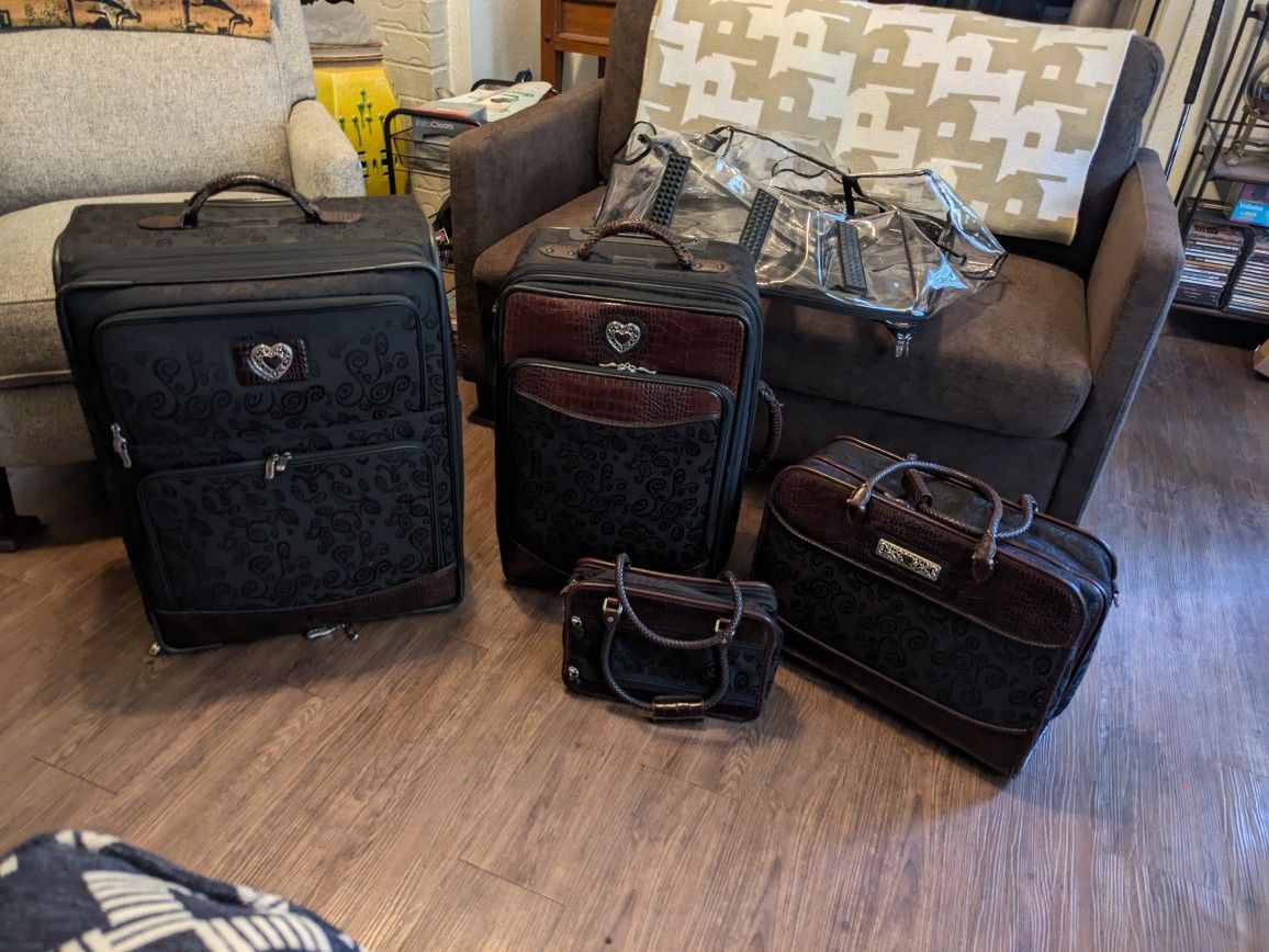 The four pieces are in excellent condition.Barely used, mostly stored. Set Includes: 25"large wheeled suitcase with clear protective case. 22" wheeled carry-on bag with protective cover. Weekend/Overnight carry bag. Small cosmetic /toiletries carry bag . Interior packing inserts. Pieces can nest into the large bag for easy storage. $495.00.Reasonable offers welcomed.
