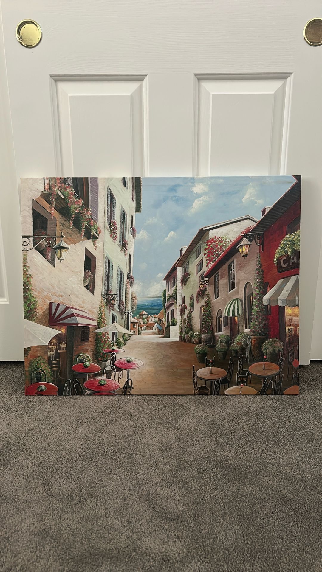 Mediterranean-style canvas wall art depicting a scenic Italian town coastal scene with outdoor cafes. Measures approximately 22 x 28 inches. Frameless canvas print in great like new condition. Pick-up location is Henderson 89012. Check out my other listings in case there is something else you like.