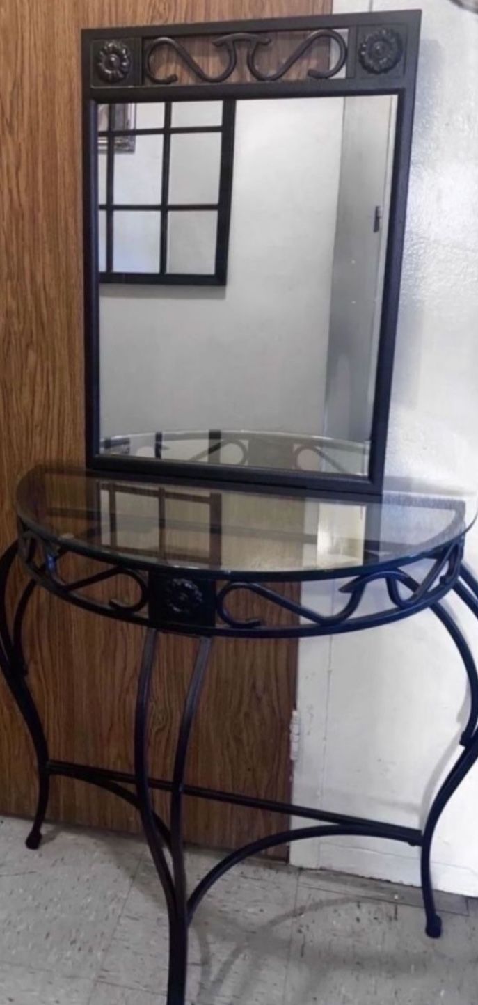 Glass Top Wrought Iron On Console With Mirror - Table Dimensions: 30in Lx 16in W x 31 1/4in H - Mirror Dimensions: 28in L× 21in W