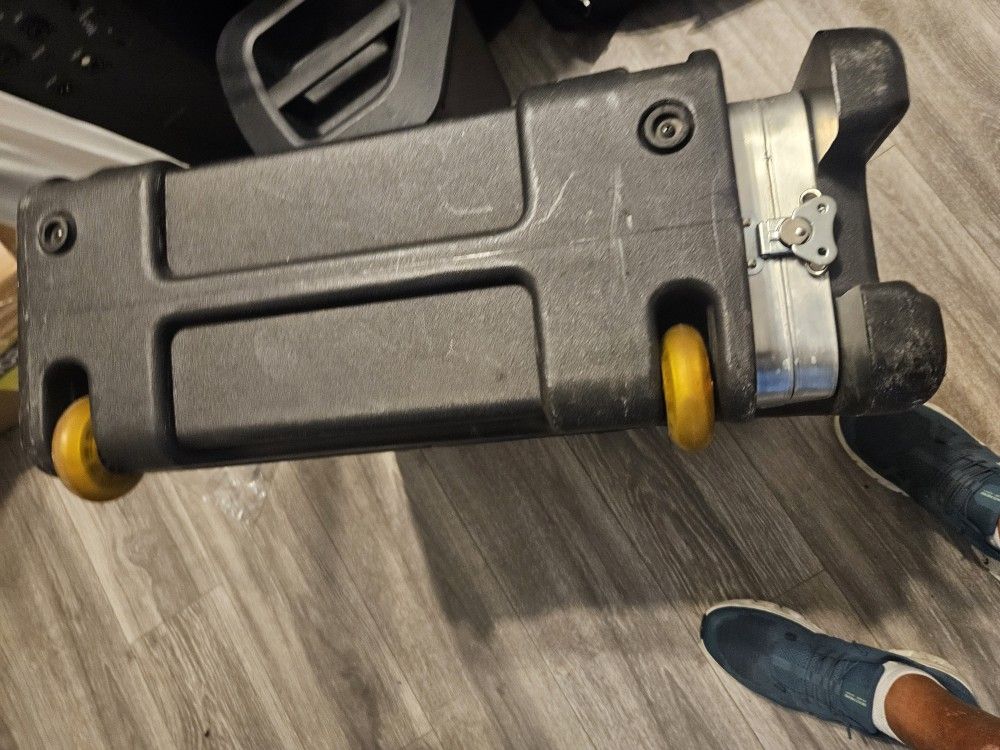 Skb 5 space rack road case. Light sturdy has wheels and recessed handle easy to transport stacks well. Great for producers and musicians on the go
