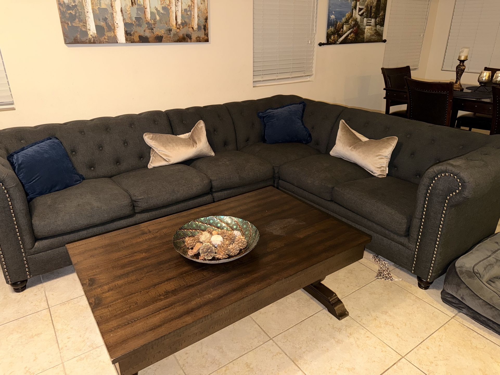 Beautiful L-shaped tufted sectional in excellent, like-new condition. Charcoal gray fabric with button-tufted back and nailhead trim on the arms. Deep, comfortable seating and very sturdy. No stains, tears, or odors. Includes accent pillows. From a clean, smoke-free home.