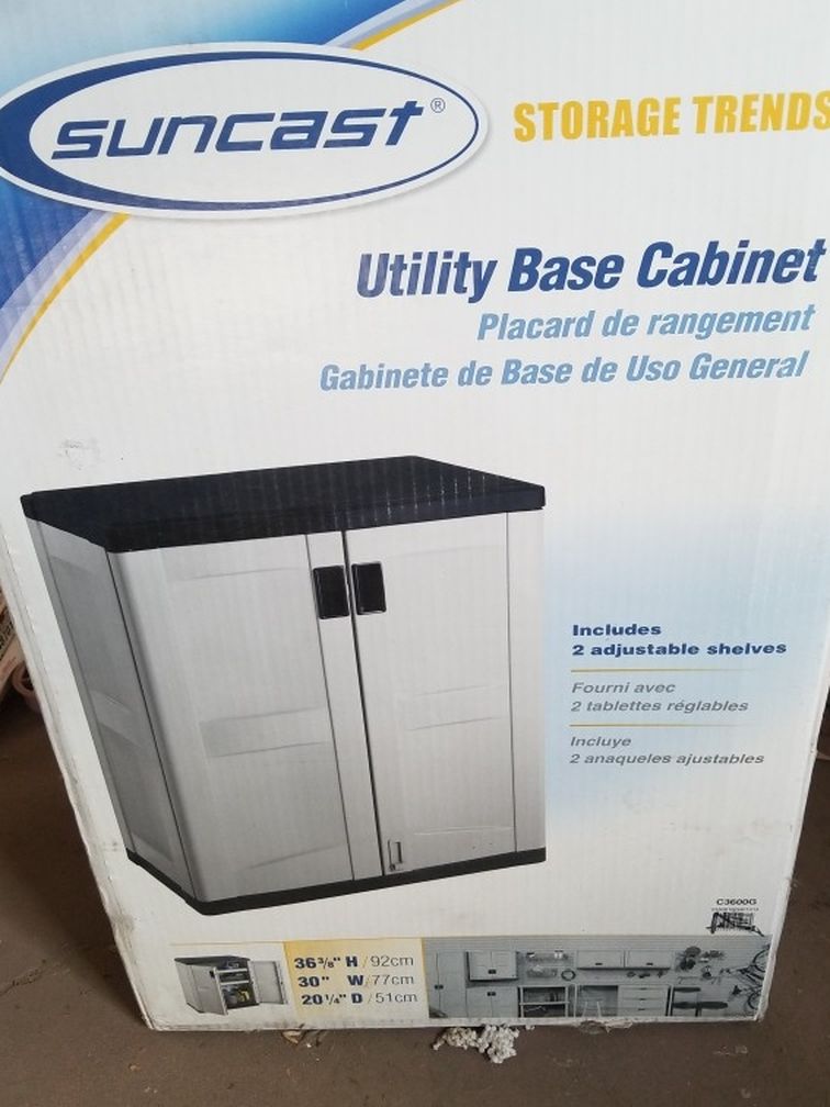New never used garage utility base cabinet, still in box, never opened. Includes 2 adjustable shelves. 36 H x 30 W x 20 D