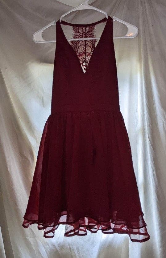 Pre-loved in excellent condition! From Maniju, a semi-formal dress with lace on the upper back. Size small Color is a darker red/cranberry Style # m24744 100% polyester #Prom #Formal #Dress #Maniju