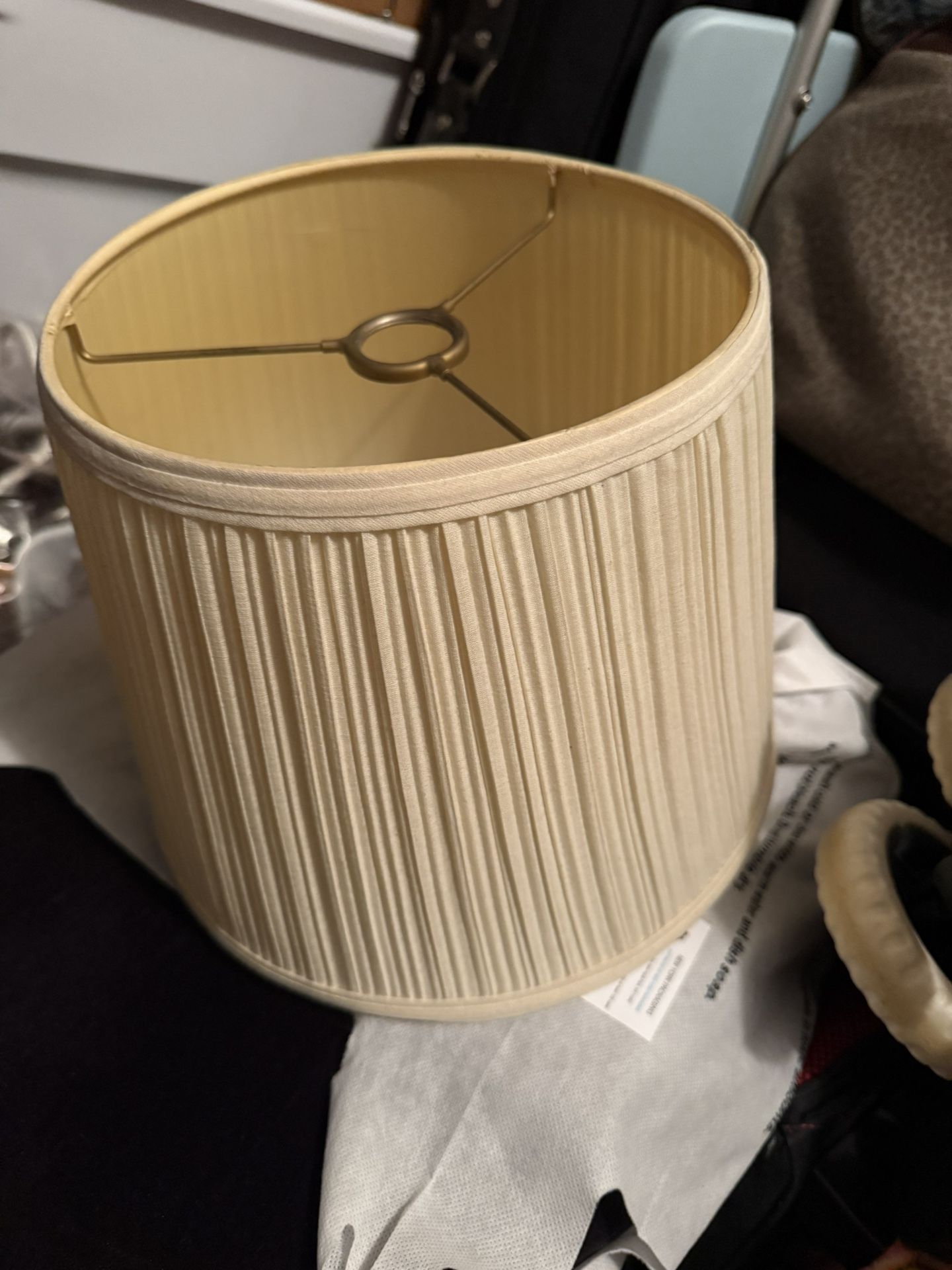One Pleaded lampshade in excellent condition. Color ivory . Fits most lamps. Approximate measurements: Top: 9.5”W bottom : 13x11.5” 8.5”H Asking Price$25.00 Firm cash only and is the only form of payment accepted no shipping available Free delivery to the following northern New Jersey and Rockland County New York locations listed below no other locations available Passaic County Clifton Plaza, Dunkin’’ Donuts parking lot 1006 Route 46 W. Clifton, NJ 07013 Bergen county New Jersey Stew Leonards parking lot 700 Paramus Park Mall Paramus, NJ 07652 Rite Aid parking lot 265 Pascack Ave., Township of Washington, 07676 ShopRite parking lot 180 Broadway, Elmwood Park, NJ 07407 Rockland County, New York this location one time a week most Saturday afternoon early evening Wendy’s restaurant parking lot 320 Route 59 Airmont, NY 10901 Please check the merchandise all sales final No returns if interested Please leave a message. Thank you.