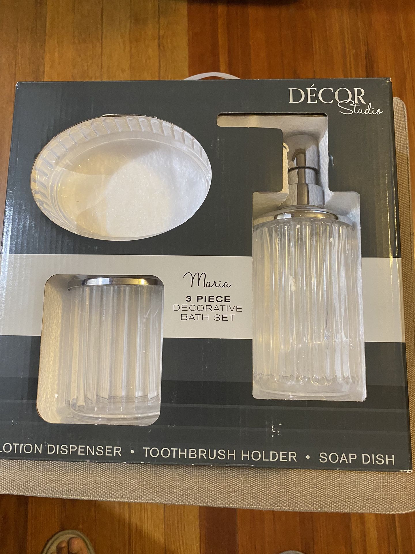 Maria 3pc Decorative Bath Set: 1 toothbrush holder, 1 lotion dispenser, 1 soap dish Color: Clear