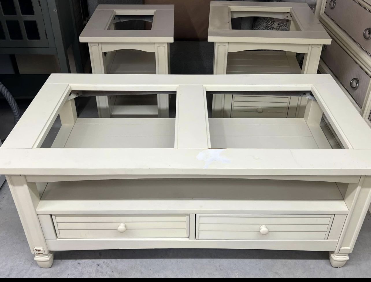 Off White matching living room set. Coffee table and 2 end tables. Glass tops on coffee and end tables. Coffee table and end tables got a little damage from movers. Pictures of damages provided. Originally purchased from Kane’s Furniture