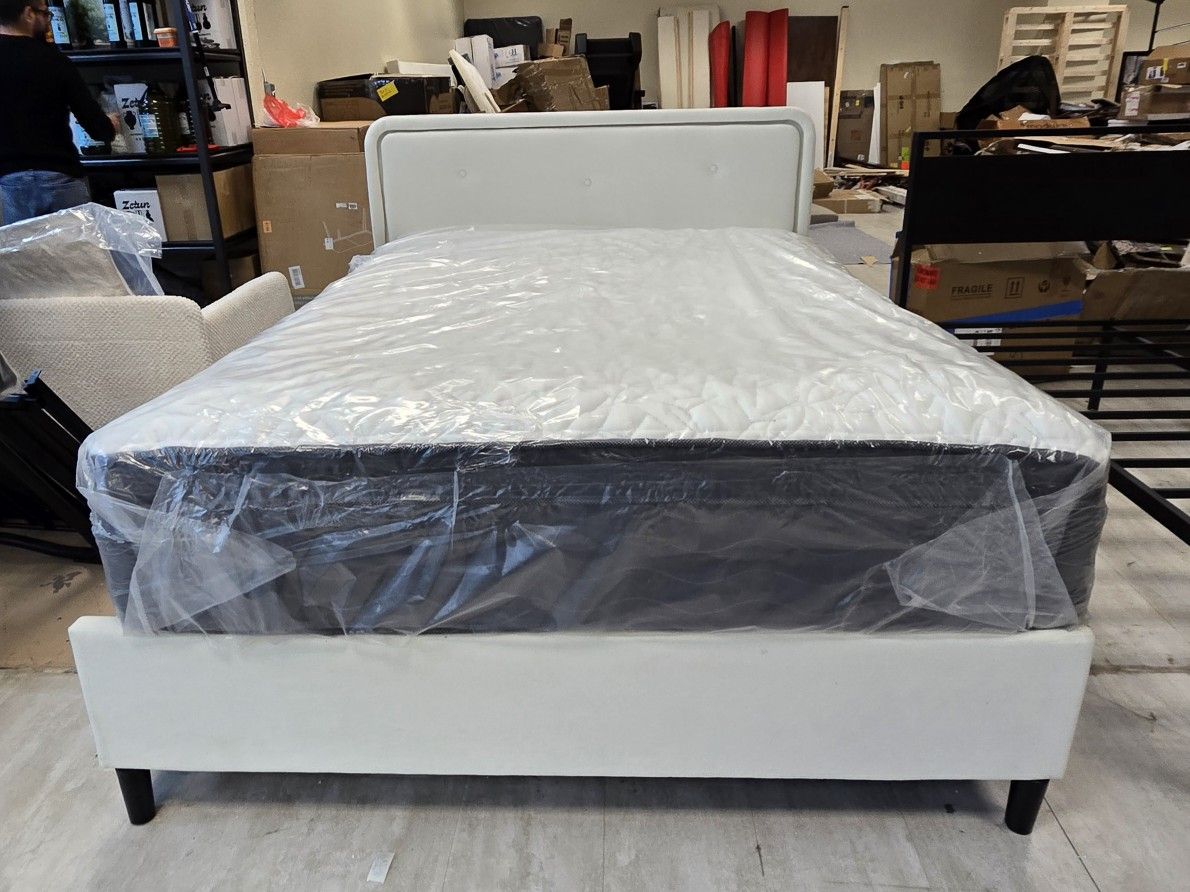 BRAND NEW Victor Rounded Upholstered Bed with Headboard & Wooden Frame,Queen,Ivory Descriptions & Features : Elevate your bedroom with this luxurious rounded upholstered bed, featuring a soft fabric headboard that adds texture and sophistication. The gently curved design enhances comfort while creating a stylish focal point. Built with a durable frame, this bed provides lasting stability without the need for a box spring. Its modern low-profile silhouette and versatile aesthetic complement a variety of bedroom interiors with ease. Features : No Box Spring Required MODERN STYLE: Features a gently rounded bouclé headboard and low-profile frame, creating a sleek, elegant centerpiece that enhances contemporary, minimalist, and sophisticated bedroom interiors. SMOOTH UPHOLSTERY: Soft upholstery adds texture, tactile comfort, and a refined, upscale look that enhances the overall bedroom ambiance with timeless elegance. DURABLE FRAME: Constructed with a sturdy and reliable frame, designed for long-lasting support, stability, and a secure foundation for restful and comfortable sleep every night. MODERN-PROFILE DESIGN: Modern, minimalist silhouette allows easy integration into contemporary interiors while maintaining a stylish, streamlined appearance that complements diverse bedroom layouts. VERSATILE: Elegant and neutral design blends seamlessly with various bedroom decor styles, offering flexibility and adaptability for multiple aesthetic preferences without compromising sophistication. Specifications : Brand : Victor Size : Queen Overall Dimensions : 43'' H X 64.'' W X 82'' L Color : Ivory Bed Frame Material : Manufactured Wood Upholstery Material : Fabric Upholstery Fill Material : Foam No Box Spring Required Slat Kit Included : Yes Number of Slats Included 12 Slat Material : Heavy Duty Metal Center Support Legs : Yes Weight Capacity : 600 lb. Headboard Included : Yes ●Pick Up In Meriatta ●Delivery Available For Very Reasonable Fees. : $40----$60 BRAND NEW Our Outlet Price: Bed : $145 Matress : $145
