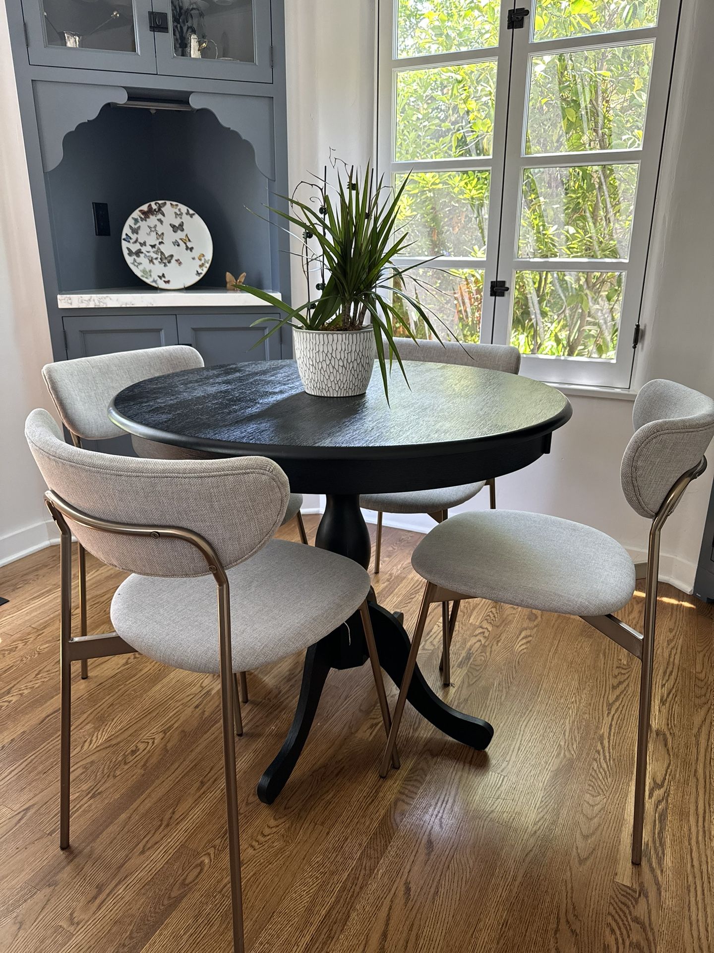 This is a very special set. The table is dark brown and the chairs are upholstered light grey with gold chairs This is one of a kind so grab it quickly before it’s gone. I paid double the price plus tax & delivery.