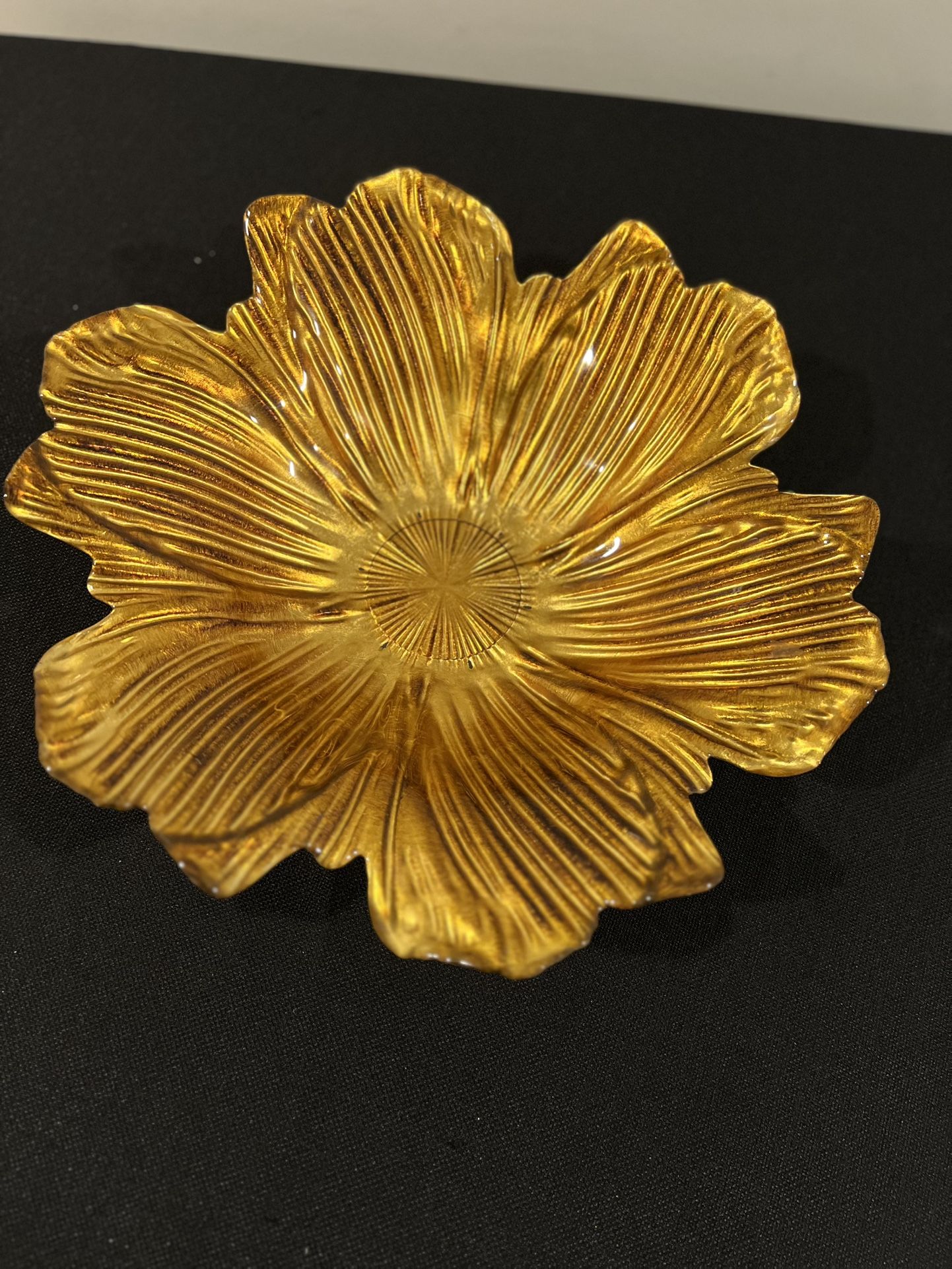 (Located in Woonsocket, RI) Marquette Floral Glass Centerpiece Gold Flower Centerpiece Bowl 15", looks like leaves.