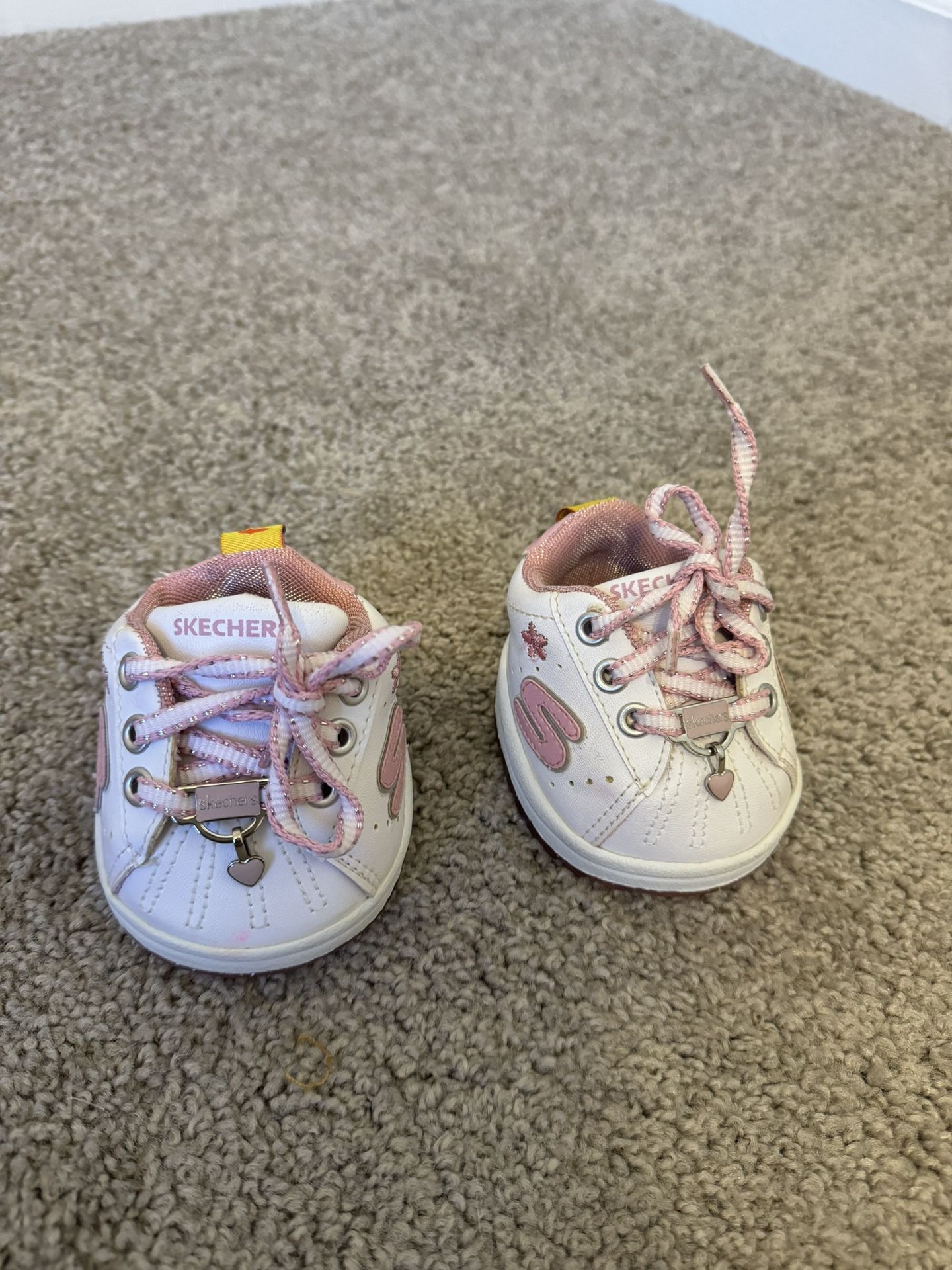 Build A Bear SKETCHERS Sneakers Pink Flower Shoes White Teddy Bear Shoes Sparkle Teddy Bear Tennis Shoes / Sneakers White/Pink/Silver - Sparkly Accents Flower Embroidered On Side Of Shoe Lace Plate With Pink Heart Charm *** last picture shows small pink stain on shoe** - open to offers
