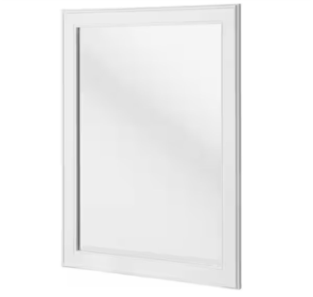 23-1/2 in. W x 32 in. H x 1 in. D x perfect above a bathroom vanity Durable poplar and medium-density fiberboard (MDF) frame construction with a wood veneer for lasting beauty Beveled glass edges add a decorative touch Sleek, rectangular design with white finish coordinates with the entire Gazette collection for complementary style Versatile design enables either horizontal or vertical hanging