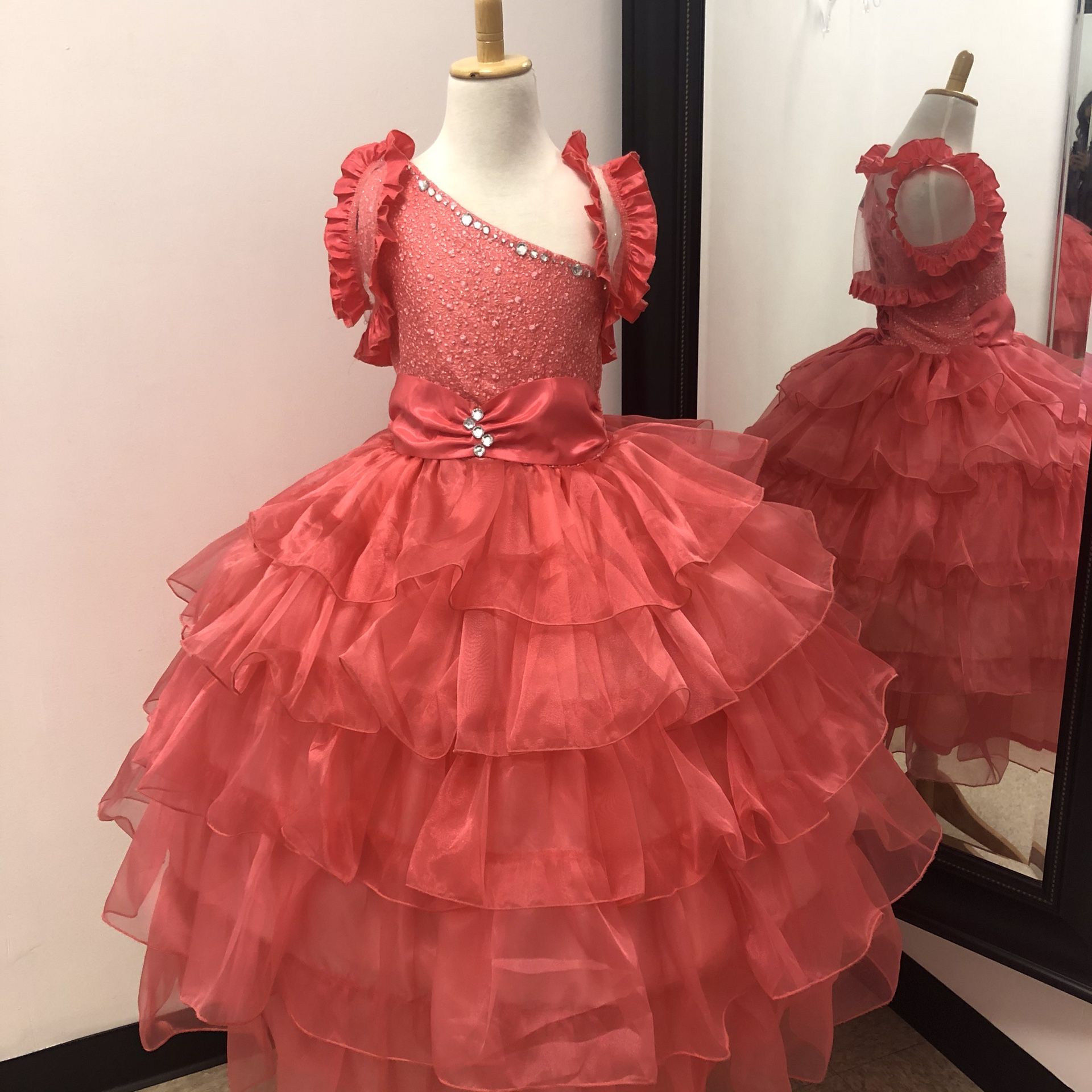 Little girls organza ruffled dress rousched waistband with crystals, bolero jacket included. Button back with lace-up corset. Available in coral/silver size 8.