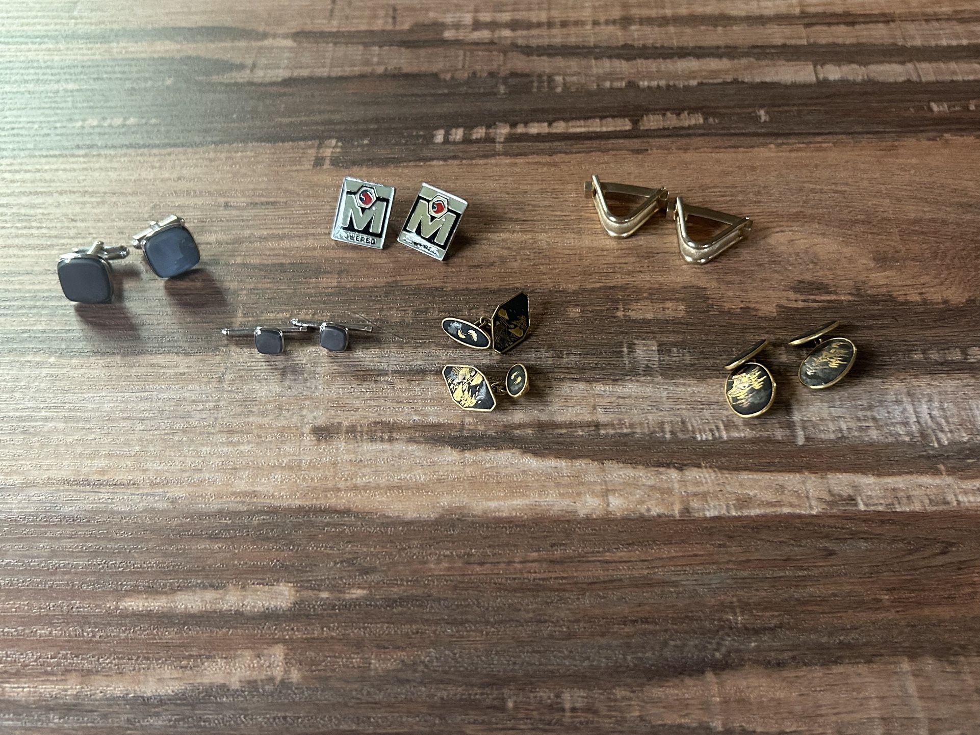 Set of assorted cufflinks and tie clips. Includes gold, black, and silver tones. Perfect for formal occasions. Set of 6 cuff links and tie clips As pictured Must buy as a set Smoke and pet free home