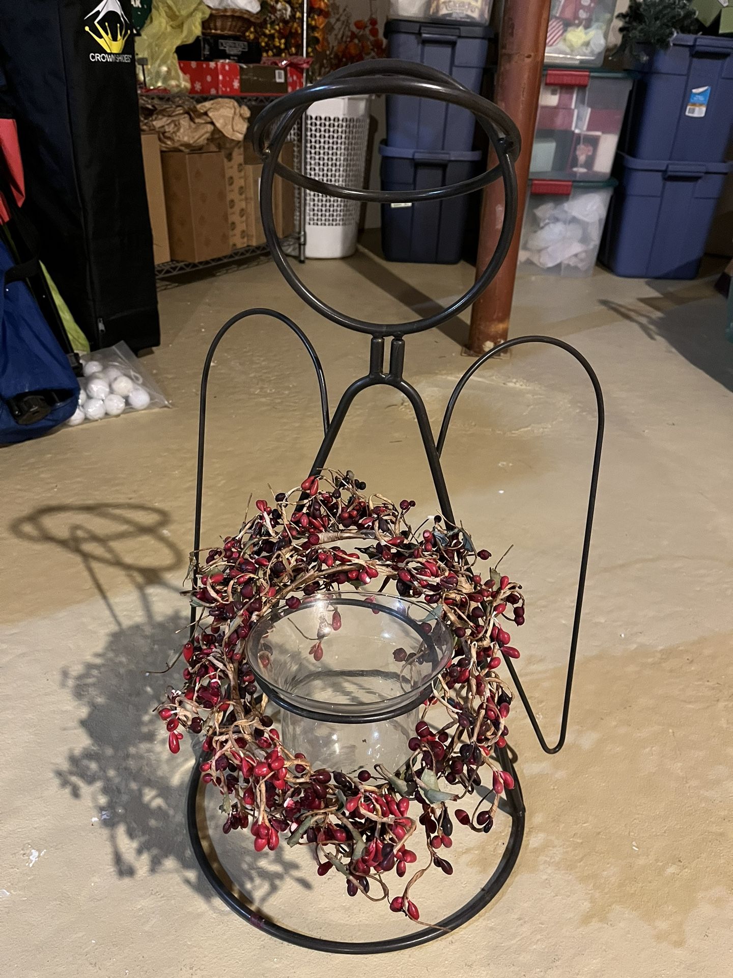 Metal Angel holding a glass candle holder/vase. Stands 2’ tall.