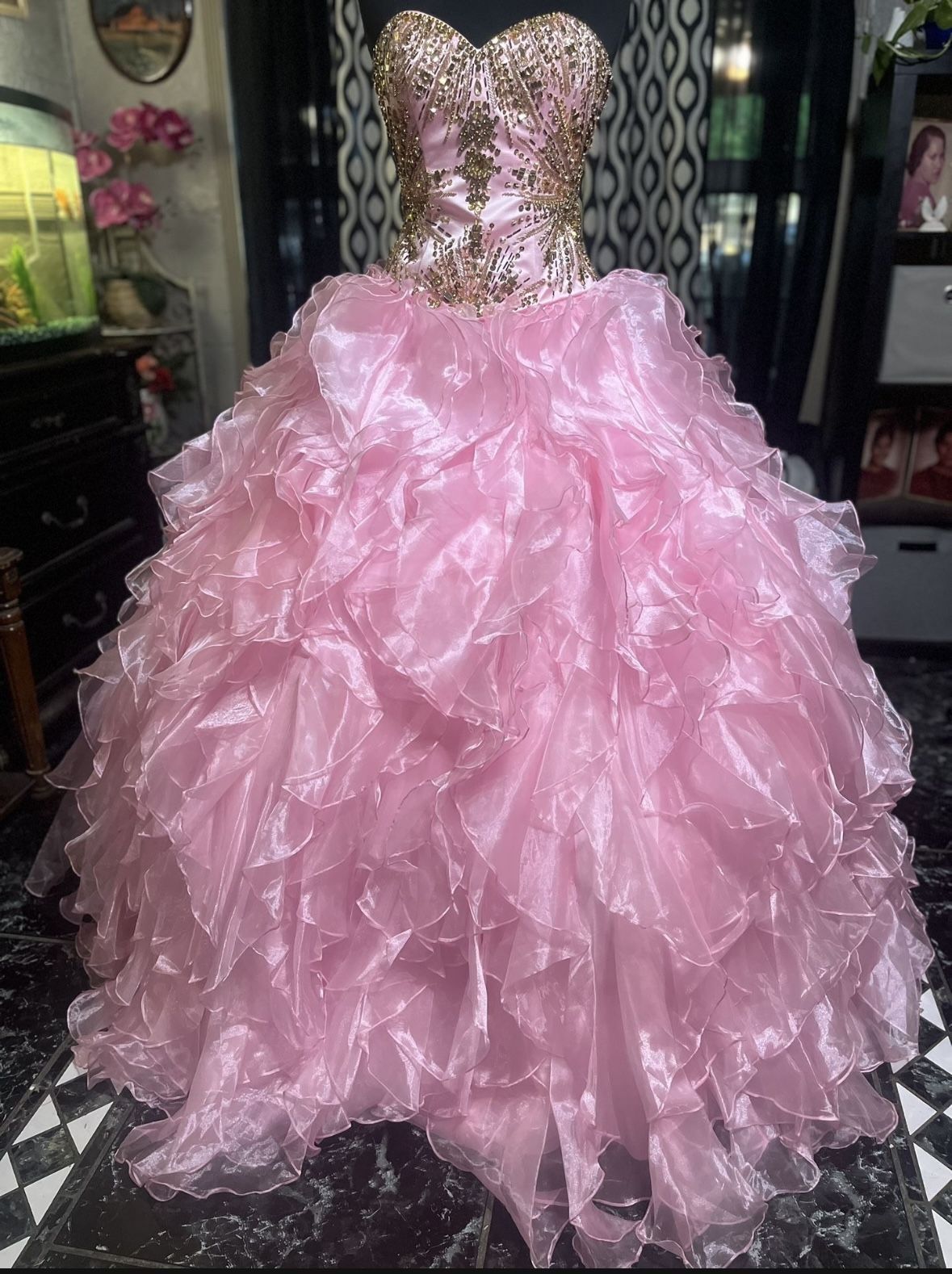 Authentic Mary’s Quinceañera dress. Size: 6 (corset- can fit a size 4 or 8) Color: Pink/Gold Style: 4T116 Original price: $500 Message me if you have any questions or if you’re interested in this dress.