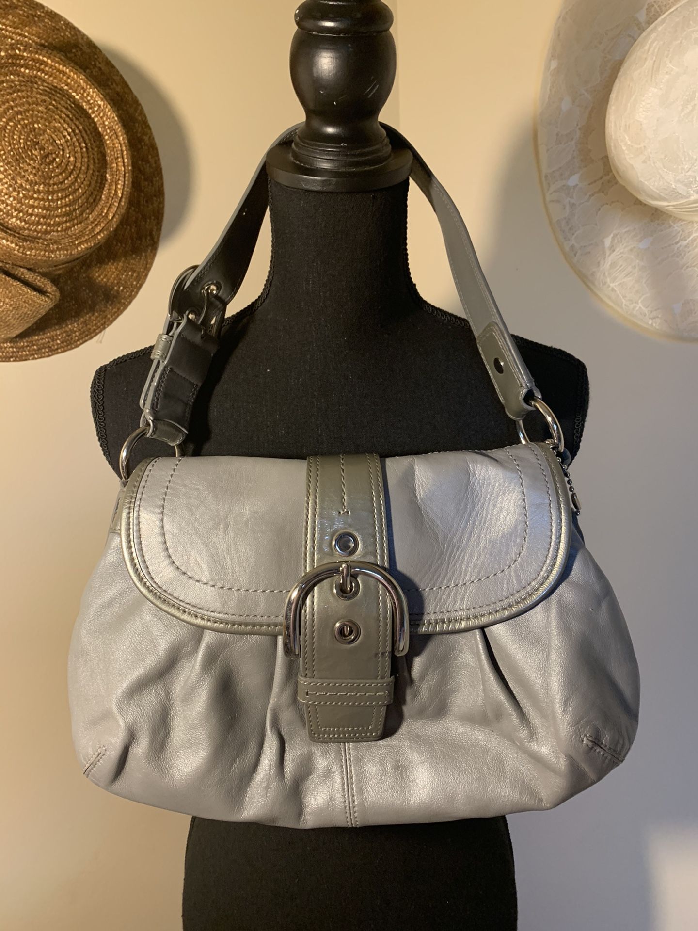 Beautiful gray leather shoulder purse. Been used but in great condition! Great to go with any outfit!