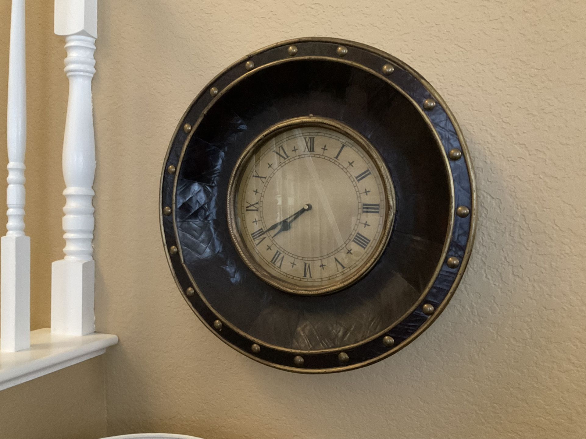 Decorative wall clock, finished in leather and large nailheads, 20” diameter.