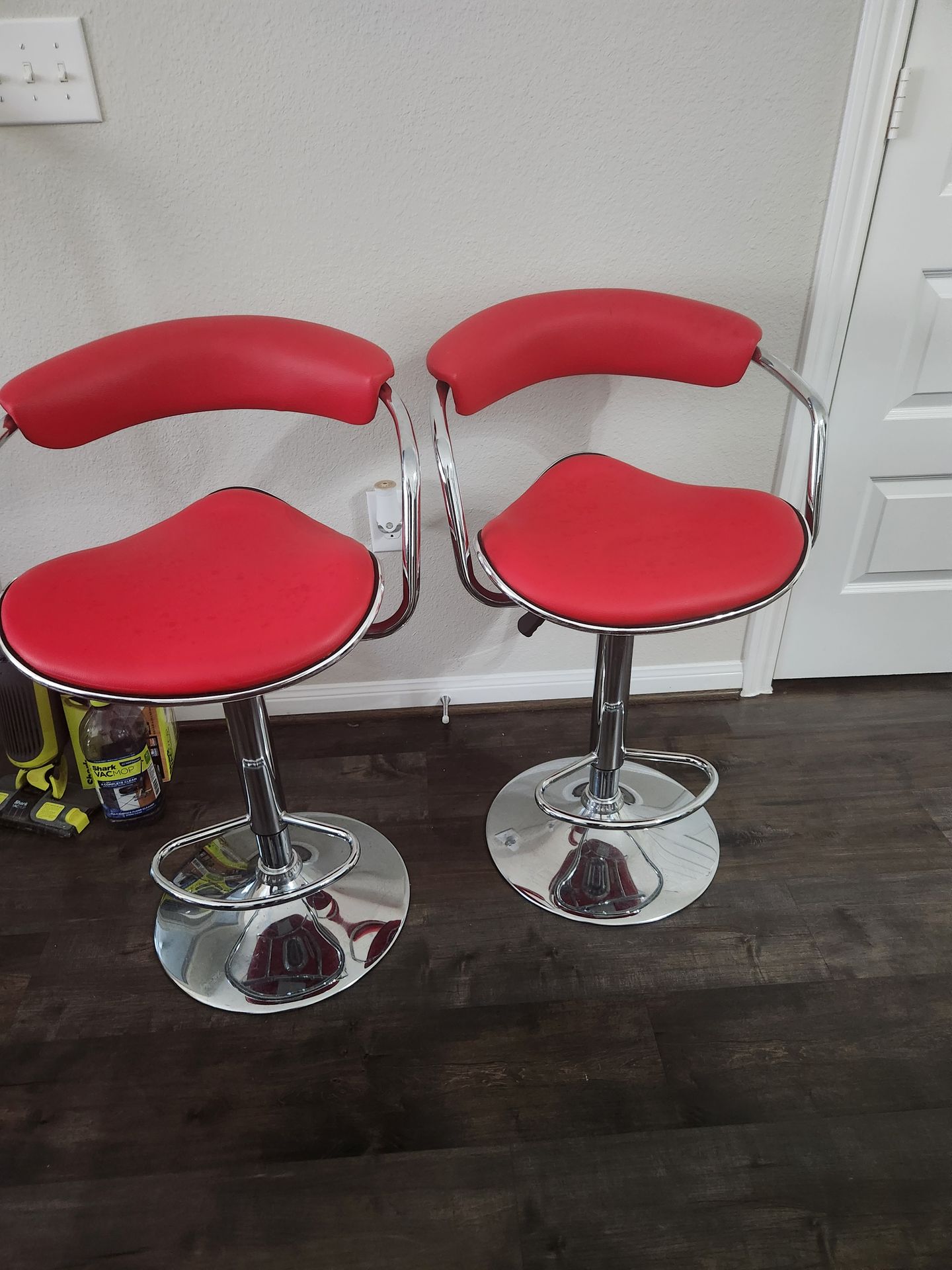 2 Red Stools , work perfectly ,some discoloration to seats but not really noticeable unless real close.