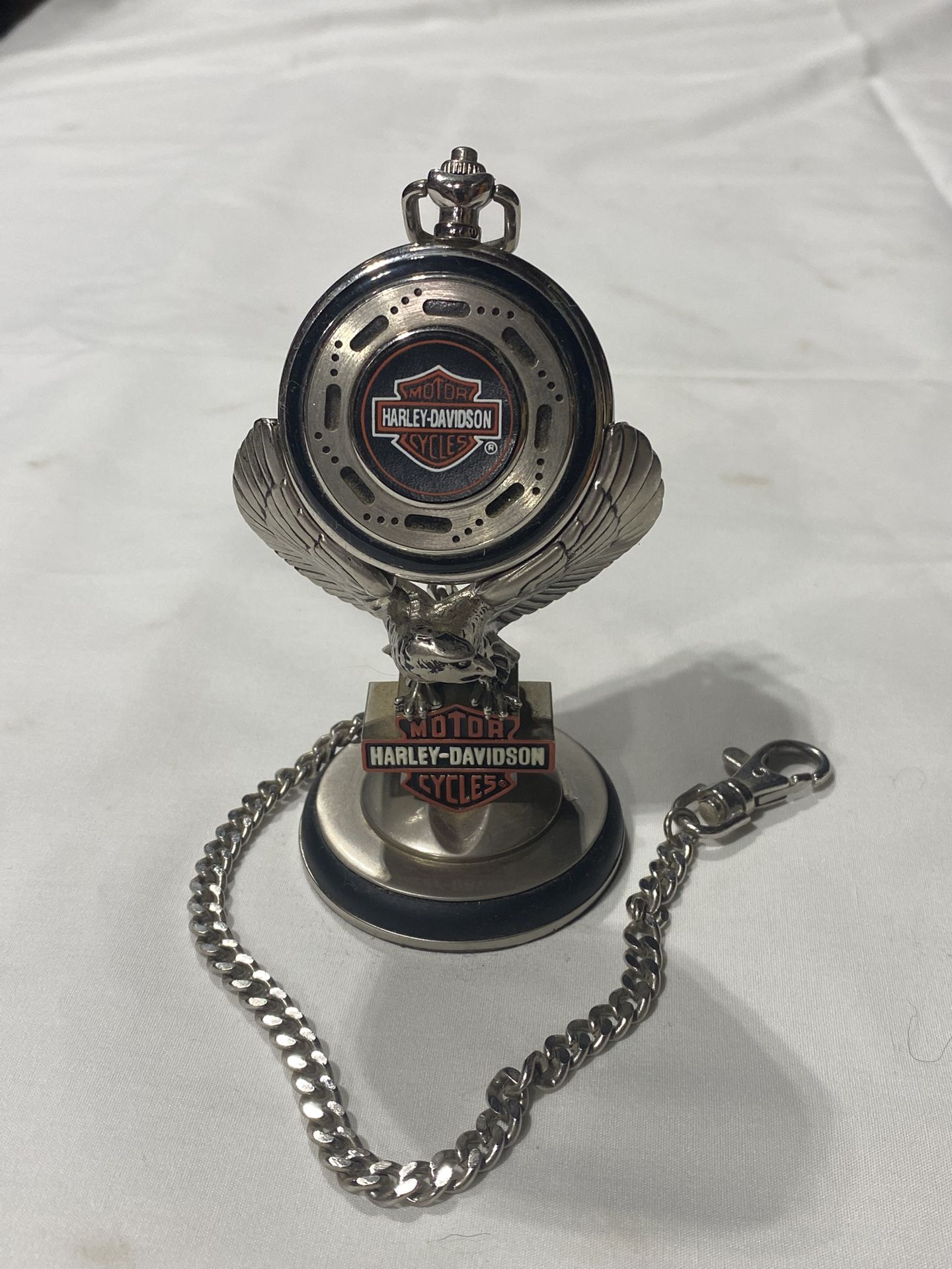 Harley Davidson pocket watch from the Franklin mint. Comes with case and stand needs a battery.