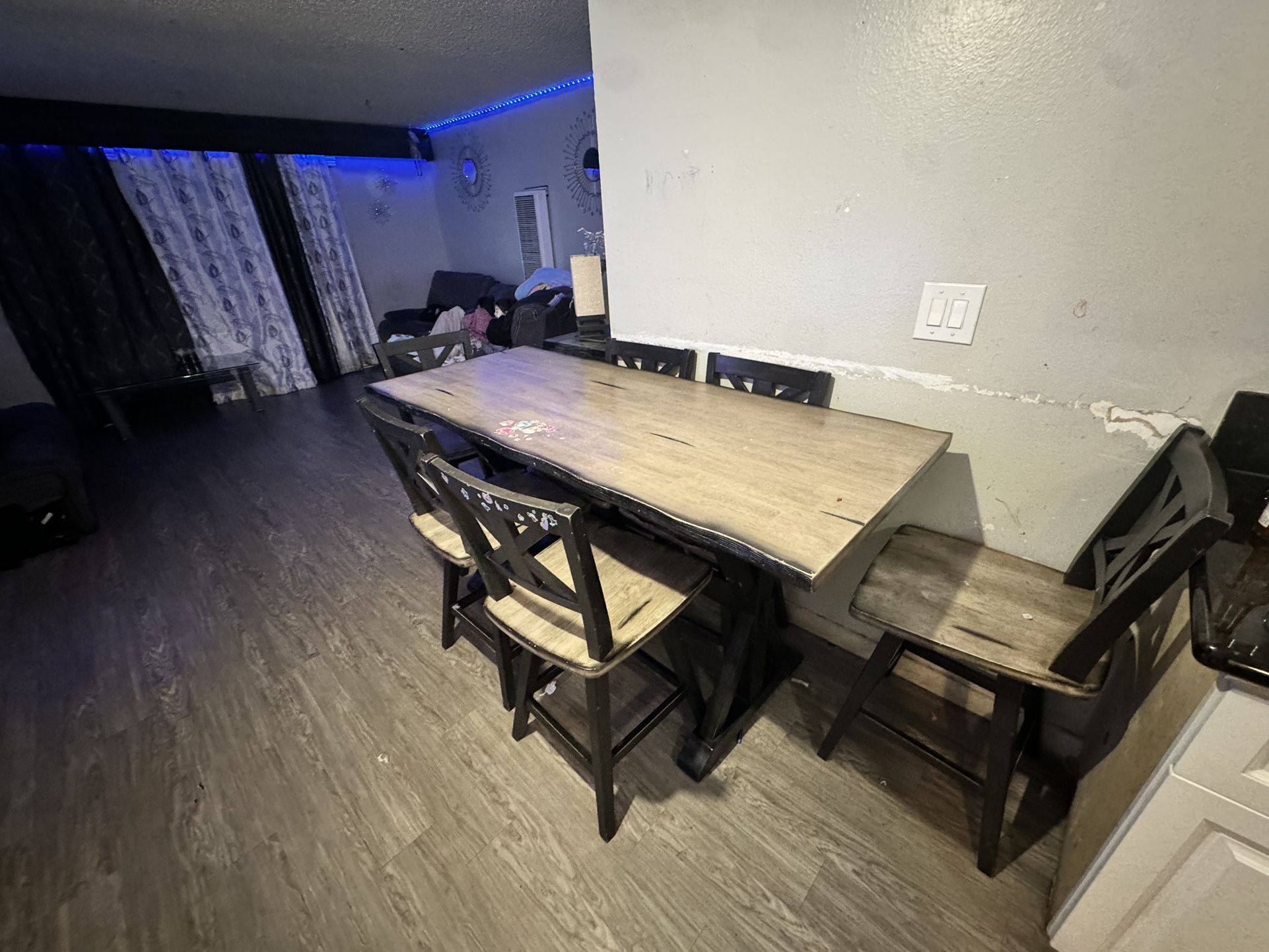 Pretty good used condition , minor scratches . 1 chair is loose , comes with 6 chairs. Table has stickers on them , can be easily removed I’ll remove them . Getting a new table . Got this table for 1,000$ throw me an offer