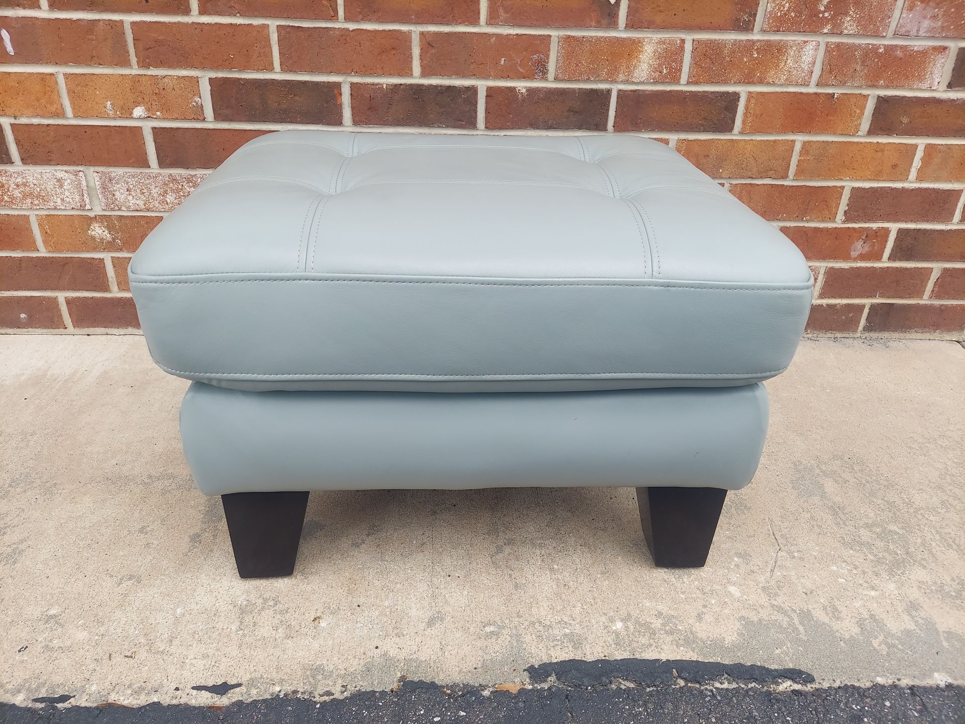 Leather Rectangular Ottoman - Soft Green Color Nicely Stitched Top - Great Gently Used Condition - Dated 5-18-2020 - Very Well Built - Has Large Square Dark Stained Legs. Measures 27" Wide x 22" Depth and 18" Tall. Price $95.00. Cash Only. For More Info Call 386**848**6224 or Texts. Thanks For Looking.