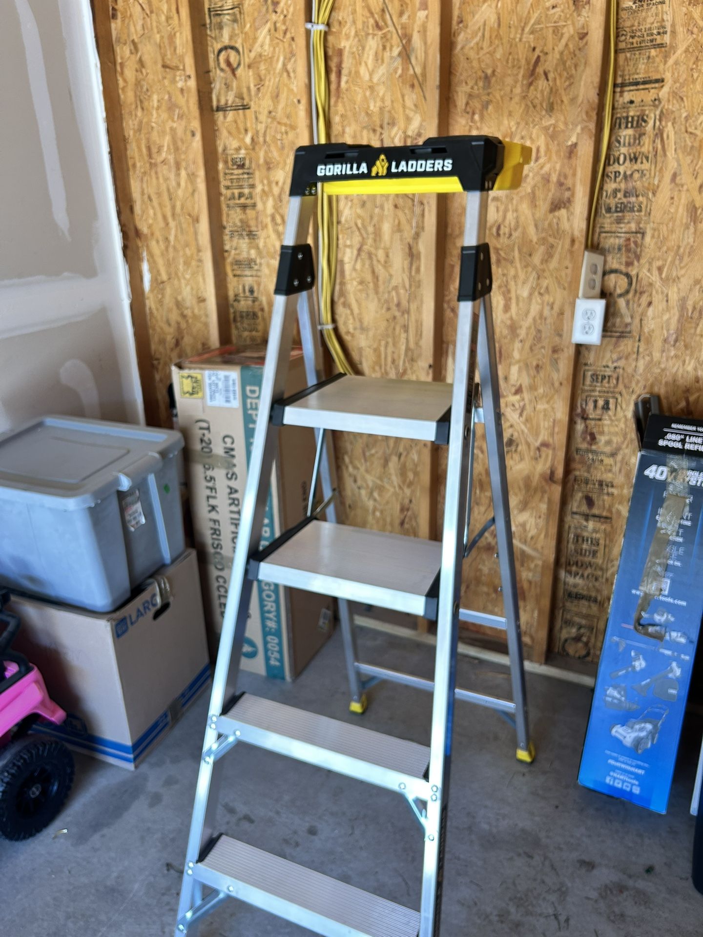 Gorilla Ladders aluminum step ladder in good condition. Sturdy, lightweight, and folds easily for storage. Includes top tool tray for tools, paint, or hardware. Great for home, garage, or job site use. Pickup only.