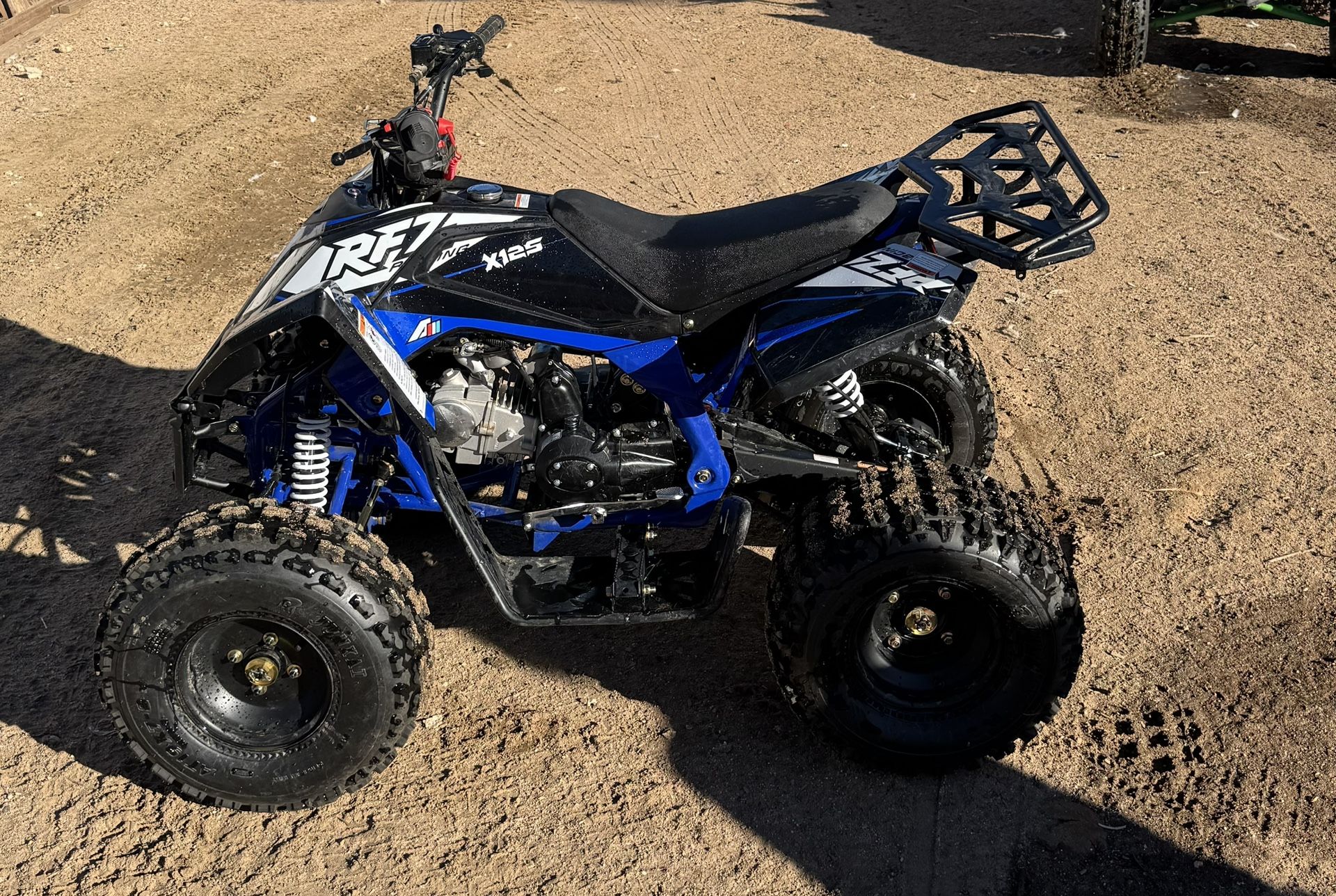2023 125 CC quad. We bought it for our girls. Fantastic for beginners. It’s only been through 3 full tanks of gas. You can look at tire whiskers, they are not worn down yet. Electric start. Asking $2000 each but willing to negotiate. We have 2, blue and green. Only blue one posted, green one exact same specs.
