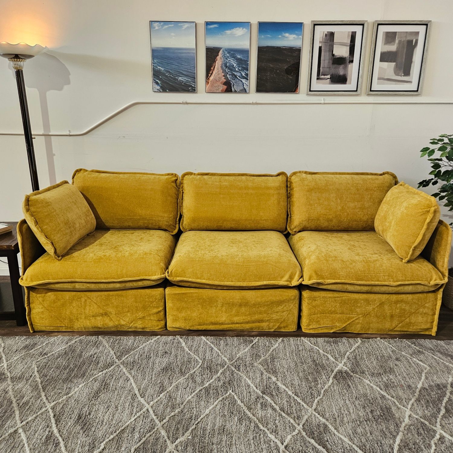 Brand new never used Gold color 3 seater You can get the ottoman for $434 on their website if desired. Ask and i can help you! All covers including the frame cover come off and are machine washable. Dimenisons: 103.5” W x 34” D x 37.5” H Couch removal service available We have flexible ways for you to get this $ Go to rodrigos couch drops fb group to get first dibs on weekly inventory I have over 10 couches in stock i probably have what you need