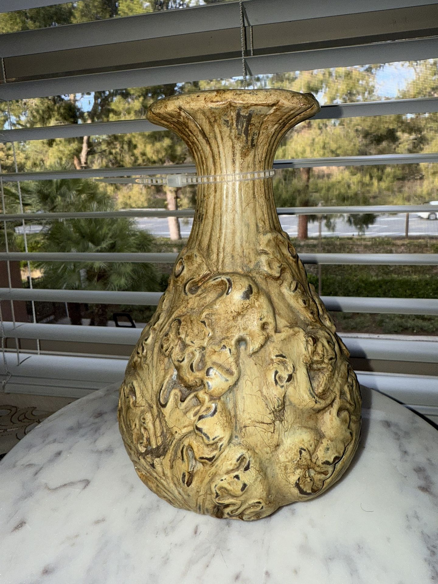 Stunning Vintage/Antique-Style Textured Ceramic Vase This exquisite vase makes a dramatic statement piece, perfect for adding a touch of rustic elegance and artistic texture to any decor. ✨ Key Features: • Distinctive Texture: Features a heavily sculpted, organic, or "burl"-like texture across the main body, creating a visually rich and tactile surface. • Rich, Patina Finish: The finish is a beautiful blend of deep tan, beige, and darker brown tones, giving it a desirable crackled or aged patina look (sometimes referred to as a distressed or antiqued finish). • Elegant Shape: Classic silhouette with a wide, bulbous base that tapers up to a fluted/bell-shaped neck, suitable for displaying dry floral arrangements, grasses, or simply standing alone. • Versatile Decor: Excellent for rustic, Tuscan, Mediterranean, traditional, or transitional interior design styles. • High Quality: Likely crafted from ceramic, offering a substantial weight and durable feel. Note: The neutral, earthy tones and heavily textured design ensure this piece will be a captivating focal point in your living room, entryway, or dining area. 📝 Suggested Next Steps: • Headline Idea: "Dramatic Textured Burl-Style Ceramic Floor/Table Vase - Rustic Tuscan Decor" • Call to Action: Don't miss the chance to own this truly unique decorative accent!