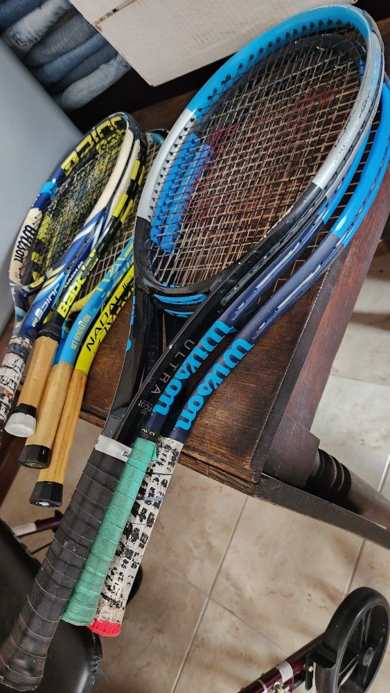 9 tennis racquets . mixture of junior and adult.