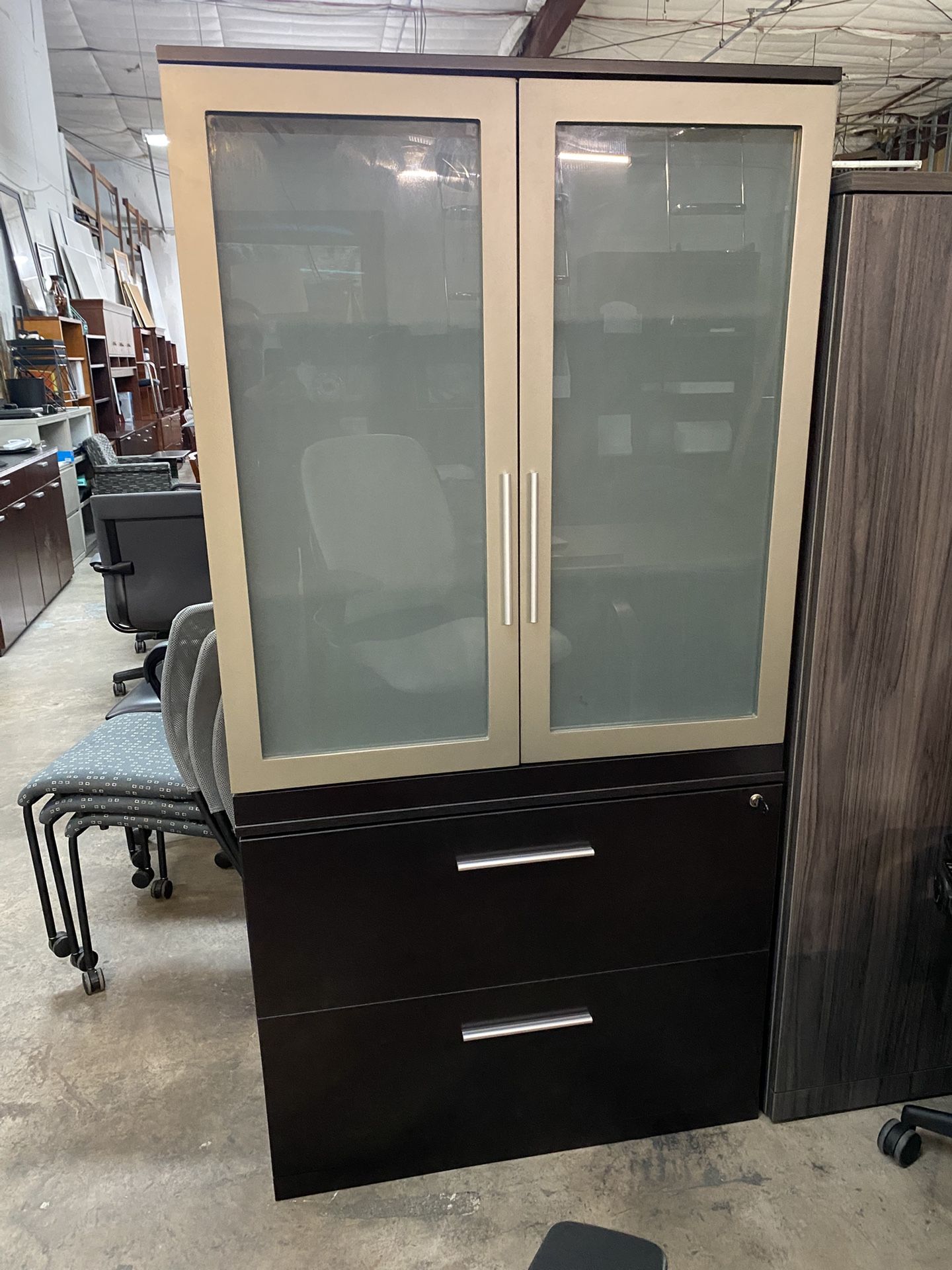 NBF 2 drawer lateral file cabinet with hutch, commercial grade, laminate in dark espresso finish, frosted glass doors, file hanging frames, working lock with key, dimensions: 36" wide x 18" deep x 71" height