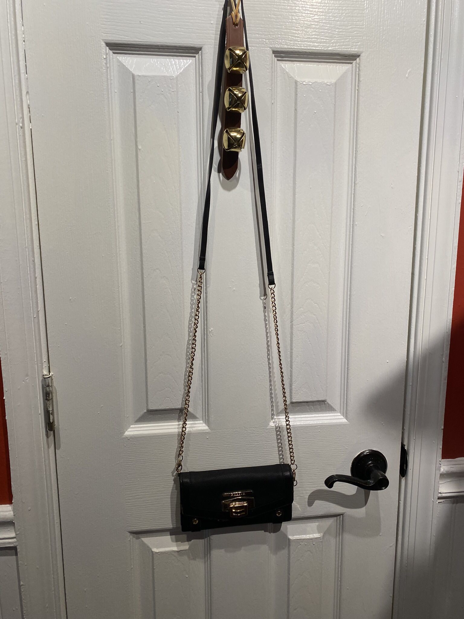 Black Leather Bessie Clutch/Purse with Long Gold Chain. Like New
